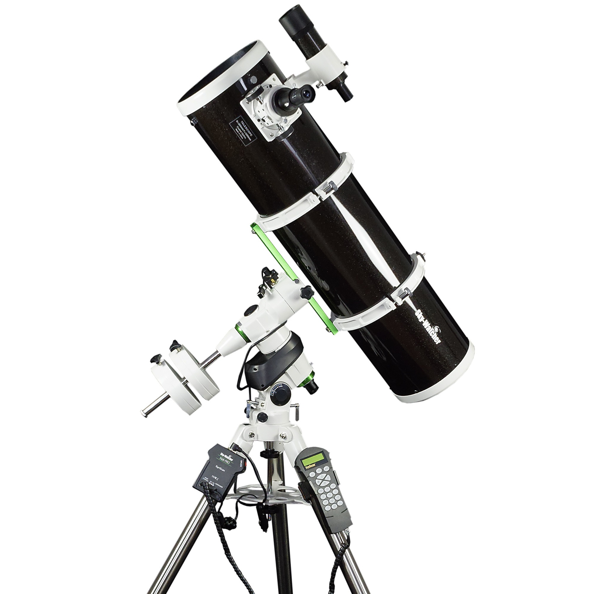 Optischer Tubus (200/1000), parallaktische Montierung EQ5 mit SynScan GOTO-Steuerung, Stahlrohrstativ, Gegengewichte, Polsucher, 9x50 Sucher, 2 Barium Super Okulare 25 und 10mm