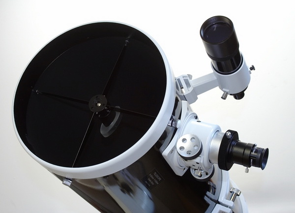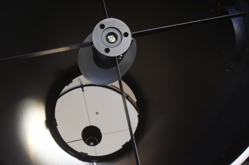 Dieser Newton mit seiner großen Öffnung von 250mm beeindruckt bei der DeepSky-Beobachtung, viele Objekte zeigen bereits deutlich Strukturen, bei vielen Galaxien erkennt man Spiralarme und Kugelsternhaufen werden meist bis in das Zentrum in Einzelsterne aufgelöst. Bei Nebeln empfehlen wir auch die Verwendung von UHC und OIII Filtern. Das Lichtsammelvermögen gegenüber dem bloßen Auge ist 1.317x, der Gewinn gegenüber der 200mm-Optik liegt bei 40%, natürlich kommt hier ein Parabolspiegel aus Pyrex zum Einsatz. Er bietet ein Auflösungsvermögen von 0,54" nach Rayleigh, bei der Beobachtung von Mond oder Planeten werden daher auch feinste Einzelheiten sichtbar, für die Sonnenbeobachtung gibt es einen gefassten Objektivsonnenfilter. Die Fangspiegelstreben sind sehr dünn ausgeführt, so dass Abschattungen minimiert und der Kontrast erhöht werden.