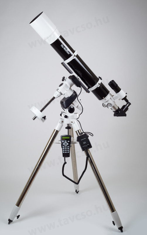 Optischer Tubus (120/1000), parallaktische Montierung EQ5 mit SynScan GOTO-Steuerung, Stahlrohrstativ, Gegengewicht, Polsucher, 9x50 Sucher, 2 Barium Super Okulare 25 und 10mm, 2“ Zenitspiegel mit Reduzierung