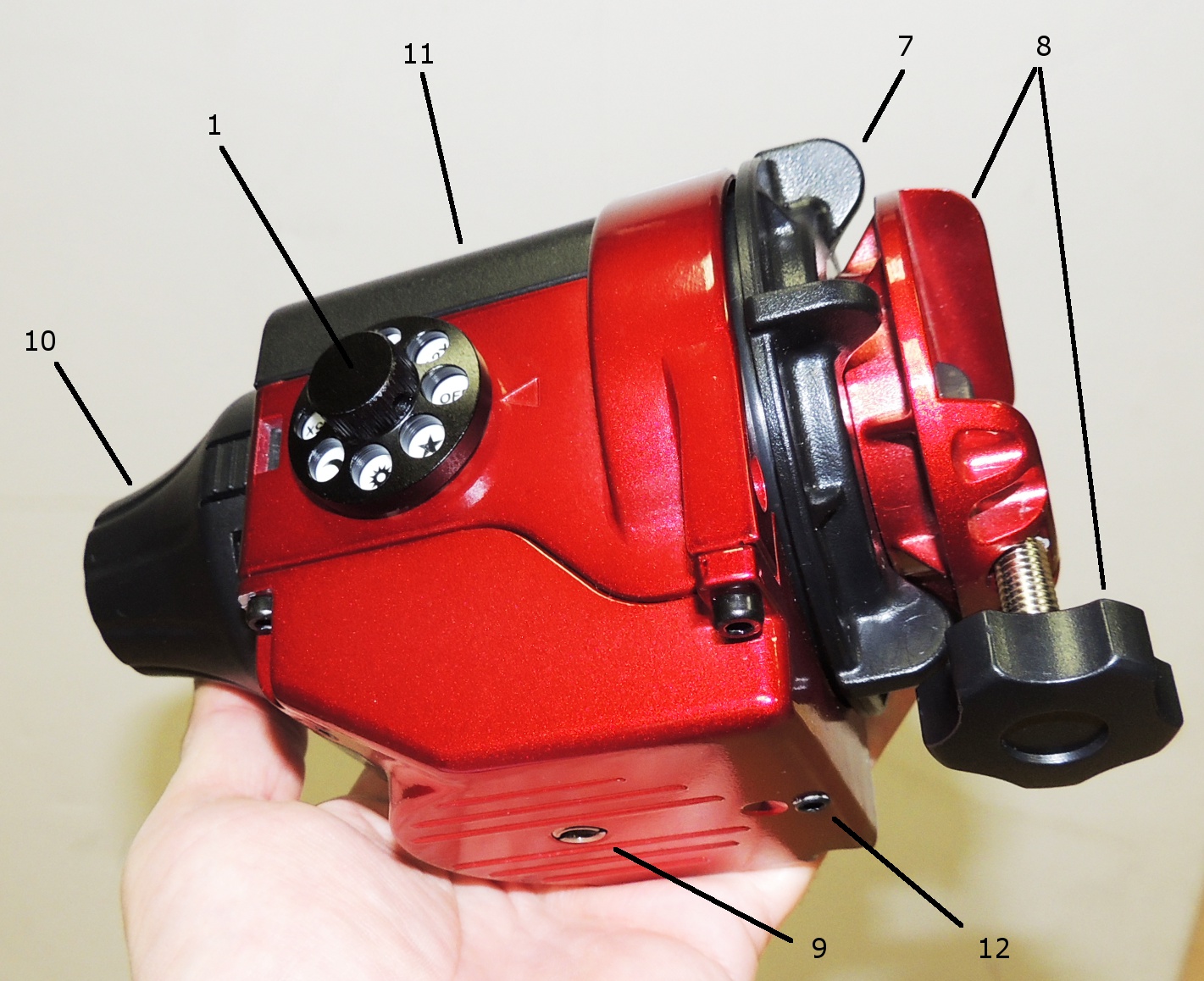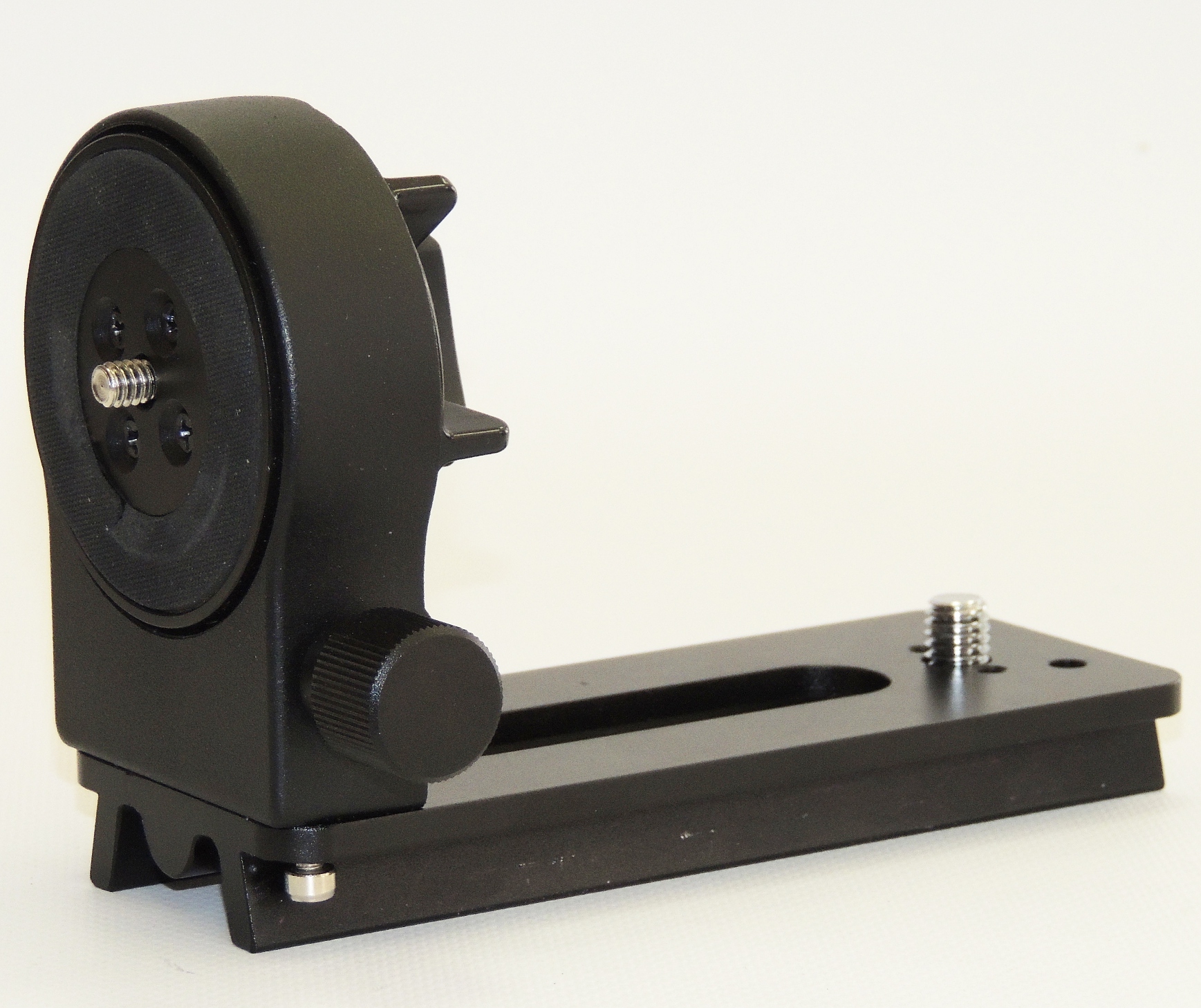 - Anschlüsse oben: 1/4" Fotogewinde (am DEC-Unit), 3/8" Fotogewinde und M8 für Gegengewichtsstange (beide an der Prismenschiene), Vixen Prismenschiene (direkt am Kopf)