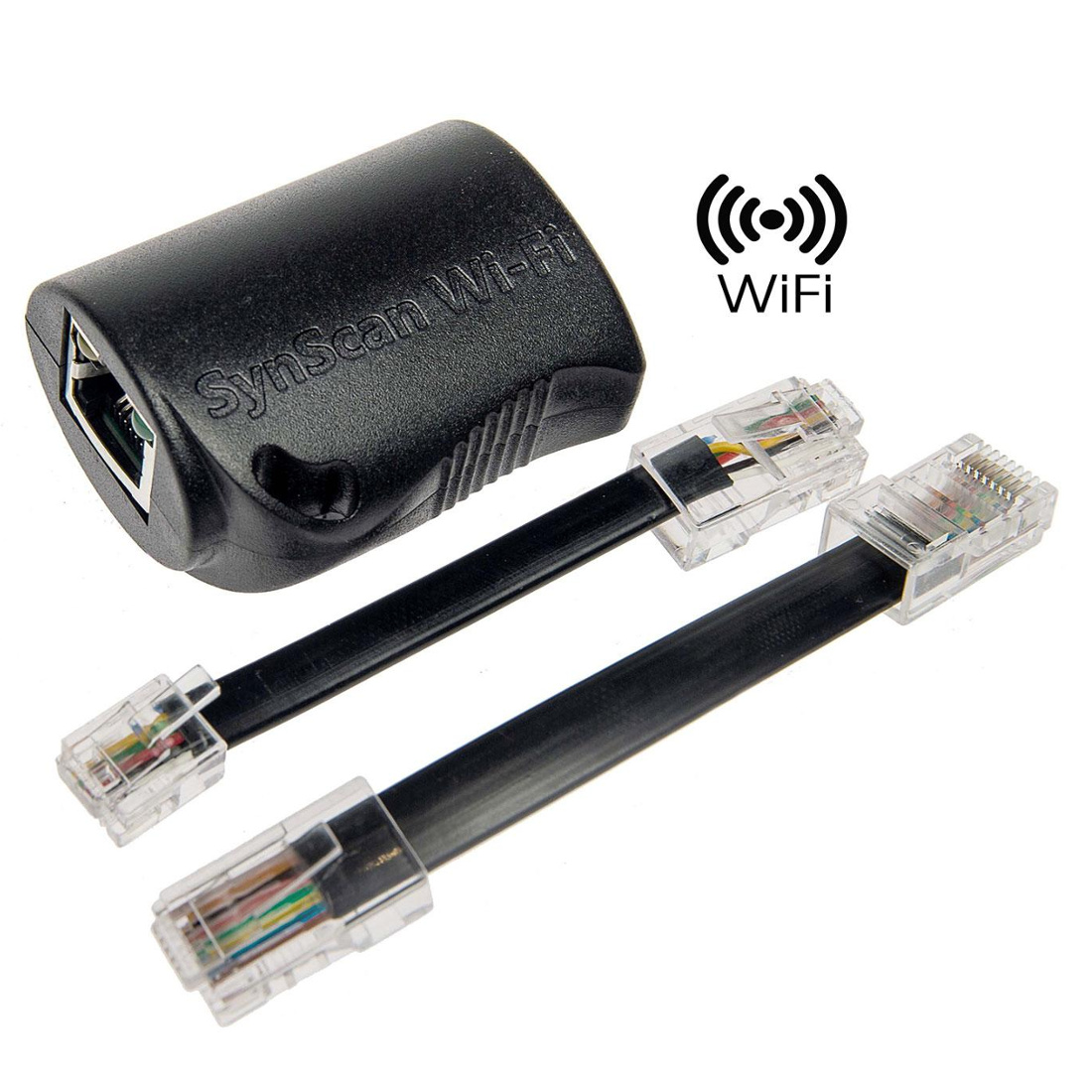Der kleine Synscan WiFi Adapter wird statt der Handbox an die Montierung gesteckt und wird zum drahtlosen Zugangspunkt. Anrdoid, iPhone, oder Tablets können verbunden werden, und über die Synscan App (freier Download im Play oder iTunes Store) oder über das Planetariumsprogramm  SkySafari (Android, iOS)  kann dann gesteuert werden. Keine Batterie nötig, der Betriebsstrom kommt aus der Montierung.