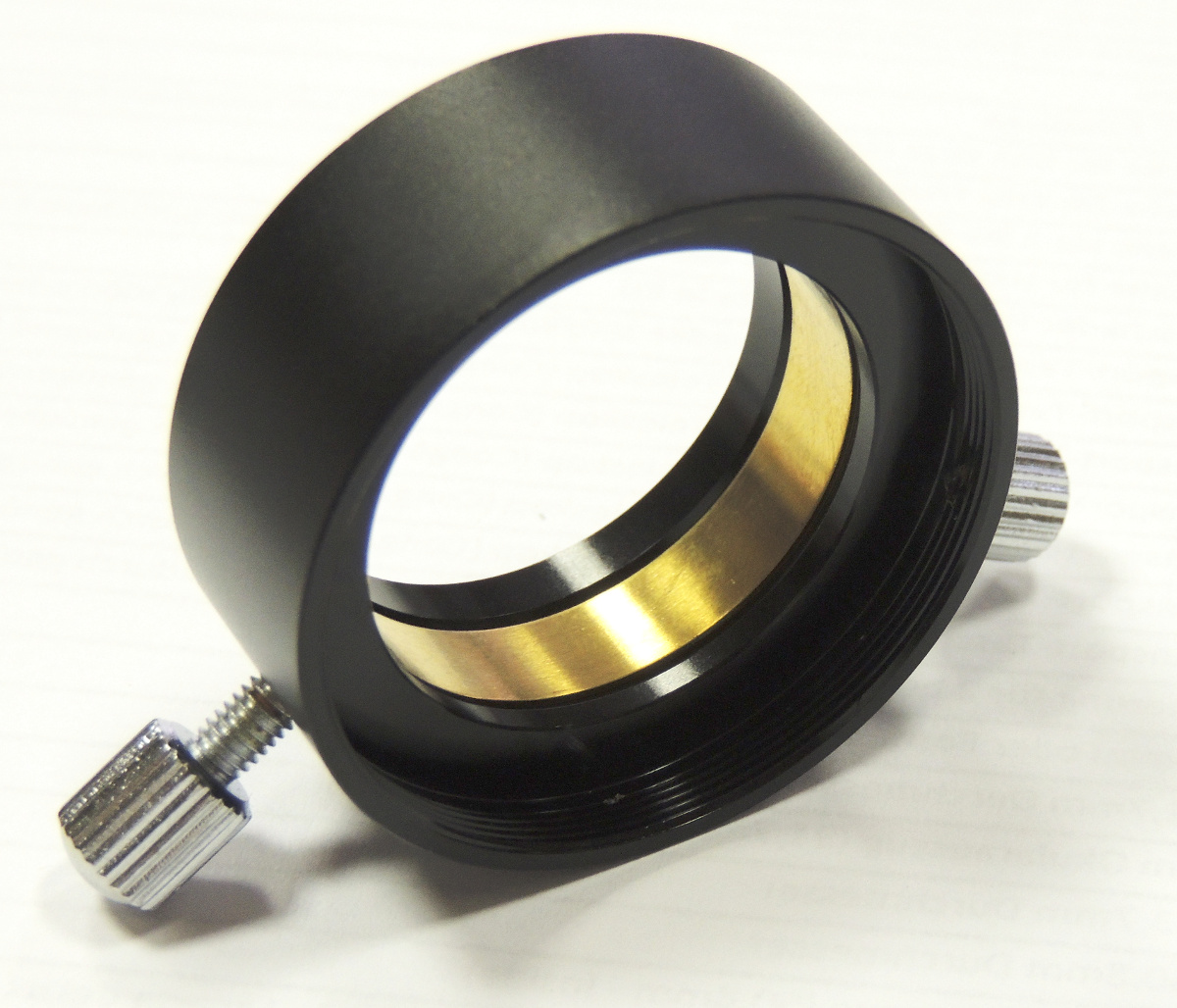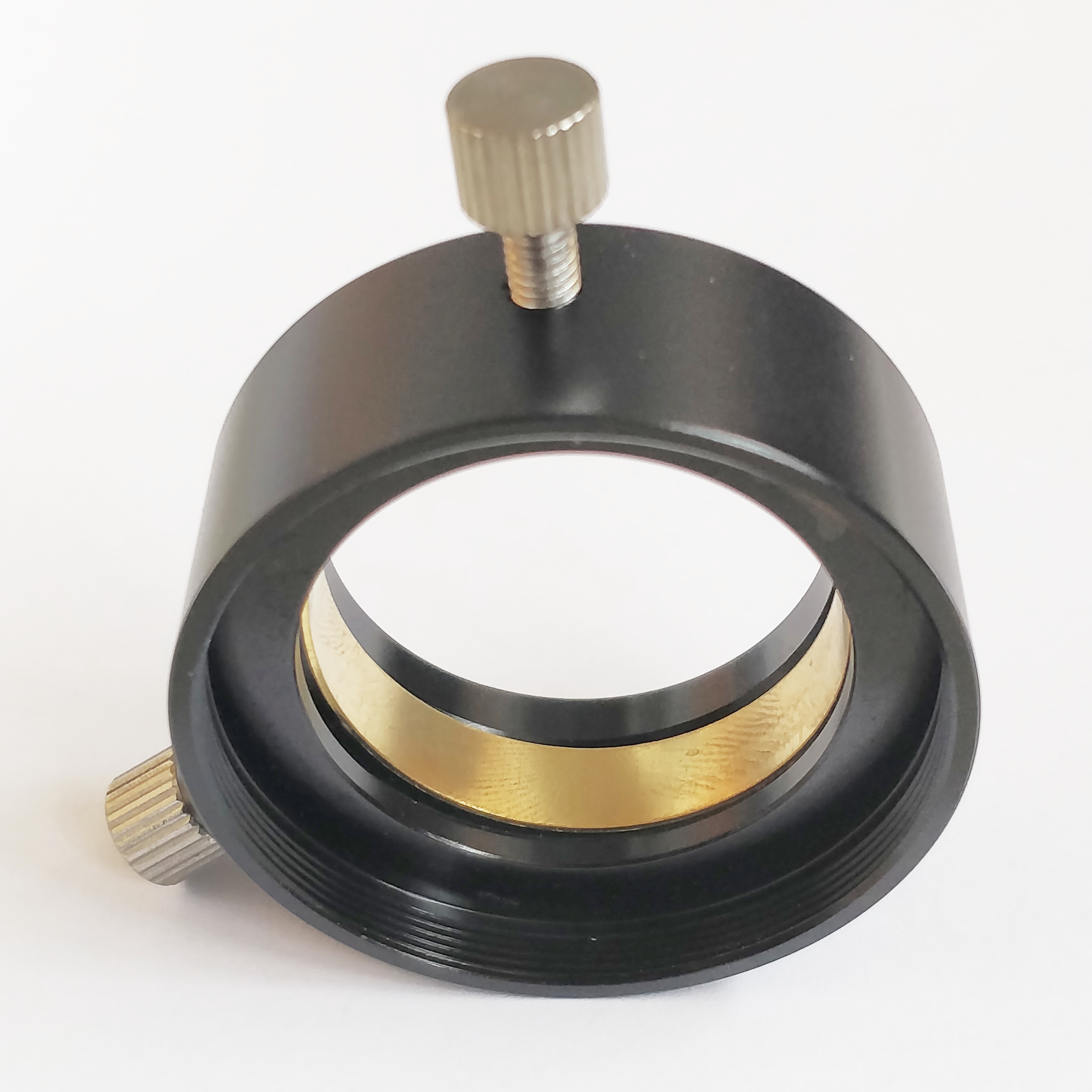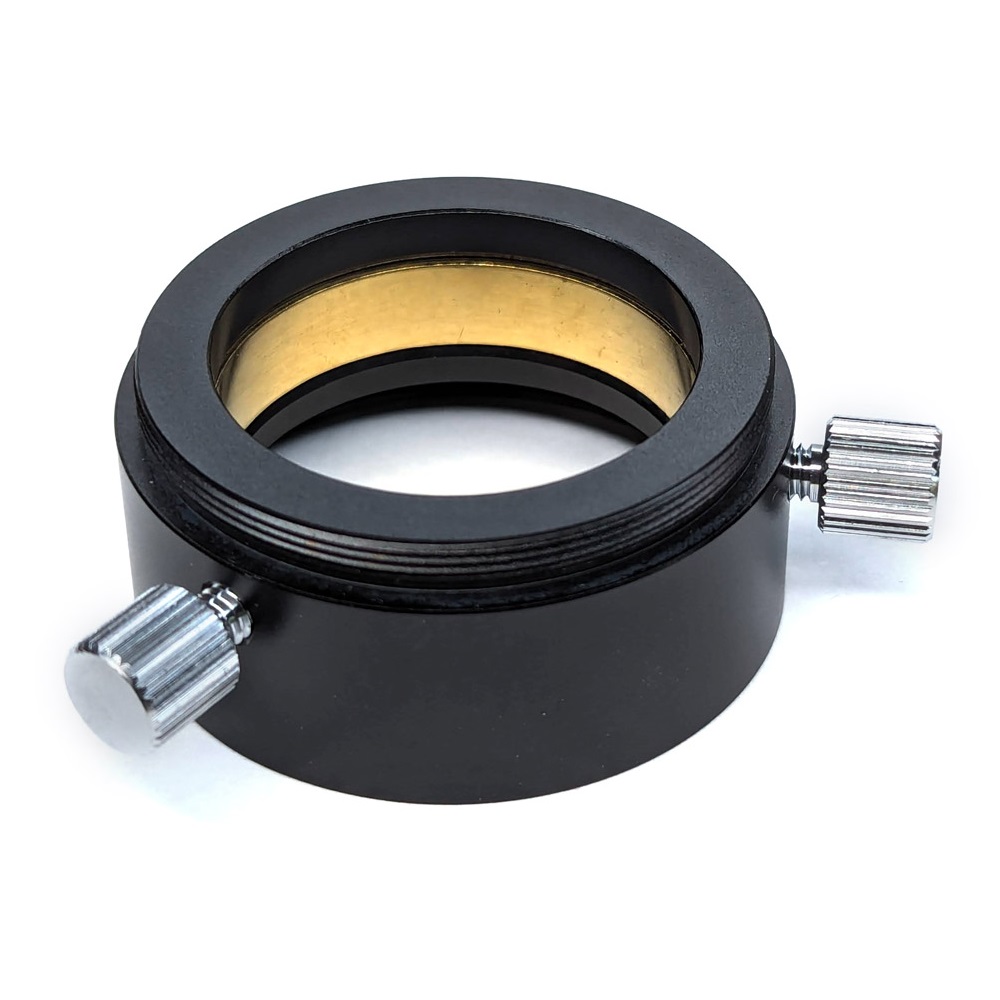 Unser neu gestalteter T2-Okularadapter ist sehr kurz gebaut (20mm Lichtweg bis zur Okular-Auflageebene) und ist sehr flexibel einsetzbar. Er hat einen okularschonenden Messingklemmring, welcher mit zwei, voneinander 120 Grad entfernten M4 Rändelschrauben geklemmt wird.