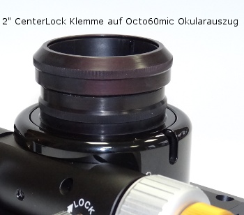 CenterLock ist nicht nur ein einfacher Adapter, welcher von einem Gewinde auf 31,7mm oder 50,8mm Steckmaß wechselt. Entgegen anderer Ringbefestigungen (ausser ClickLock), wo eine Befestigungsschraube einen seitlichen Druck an einem Messing-Ring ausübt (und dadurch das Okular aus der optischer Achse etwas wegschiebt) wird beim CenterLock System ein breiter Befestigungsring exakt zentrisch zusammengezogen. Das fixiert nicht nur bombenfest, sondern führt auch das Okular genau in die optische Achse. Die "Rumherumklemmung" des Okulars erfolgt nicht wie üblich mit einer seitlichen Schraube, sondern durch das Drehen der ganze gerippten Aussenhülse. Es gibt keine herausstehenden Schraube, oder Befestigungs-Stifte, wo man in der Dunkelheit hängen bleiben könnte.