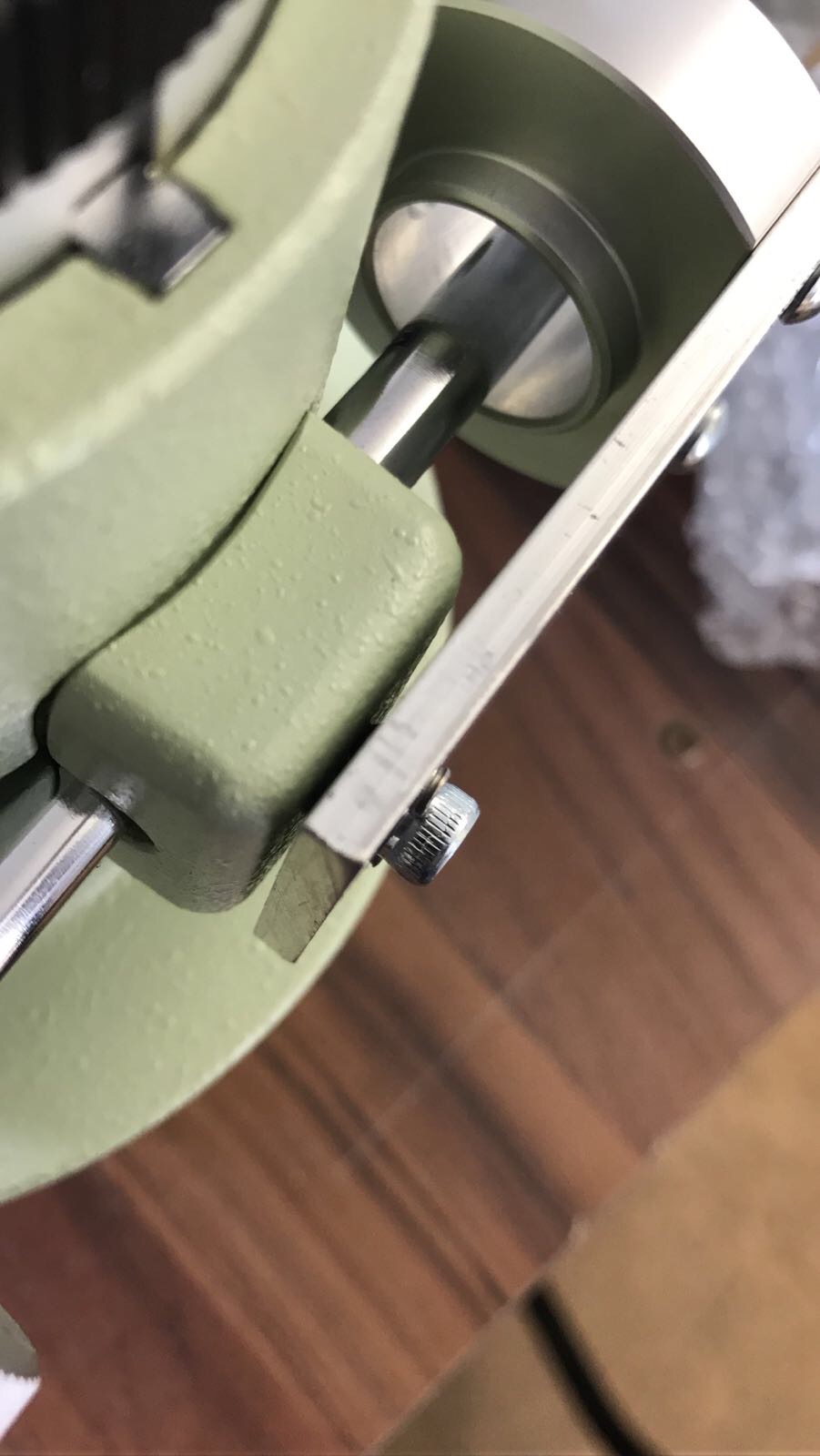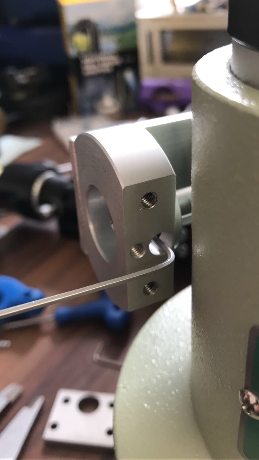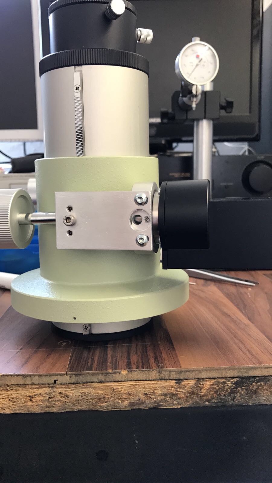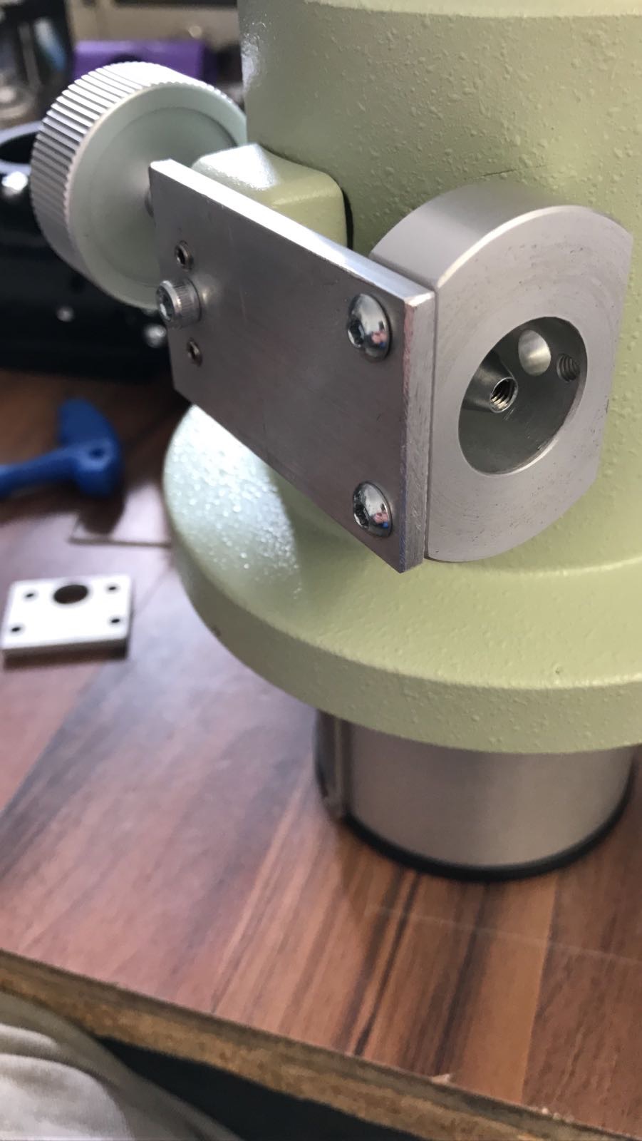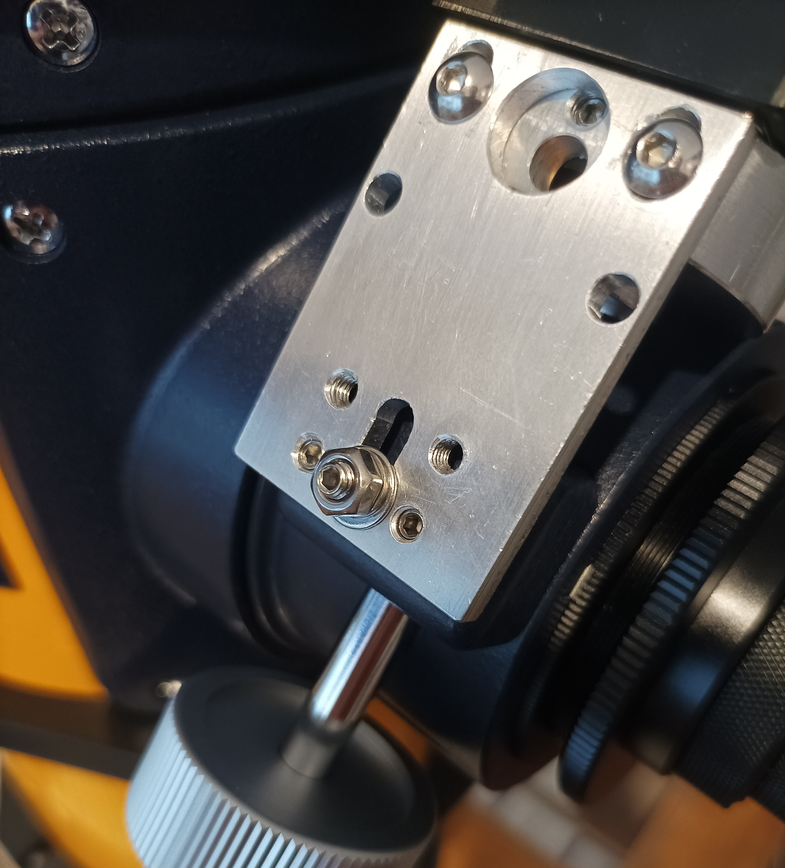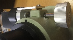 Montageanleitung neue Version mit zentraler Madenschraube: Fokusrad der Seite wo sich der Motor befinden soll entfernen. Danach die zentrale Schraube mit den beiden Einstichen entfernen. Beide Teile der Adaption zusammenbauen und am Motor befestigen, dieser muss vorher bereits mit dem richtigen Inlay für Takahashi und den beiden kurzen Madenschrauben ausgestattet sein. Danach die komplette Einheit an der Fokuswelle befestigen, diese muss nach Anziehen des ersten Madenschrauben per Hand am verbleibenden Fokusrad um 180 Grad gedreht werden, um den zweiten Schrauben der Kupplung auch anziehen zu können. Danach in das Zentrale Gewinde die 20mm lange Madenschraube eindrehen bis sie ansteht, jedoch ohne Kraft, sie steht an der Zahnstage des Auszugsrohres an!!! Anschließend werden Mutter, Federring und Beilagscheibe auf den Inbusschlüssel aufgefädelt, mit diesem Schlüssel wird dann die Madenschraube wieder einenhalb Umdrehungen herausgedreht und in dieser Stellung gehalten. Danach mit einem 7mm Gabelschlüssel die Mutter vorsichtig anziehen. Achtung, die richtige Höhe muss mit zwei kurzen Madenschrauben daneben eingestellt werden, die Leichtgängigkeit immer wieder per Hand via Fokusrad überprüfen, bei Schwergängigkeit sofort anpassen. Bei unsachgemäßer Einstellung kann die Fokuswelle verbiegen, bitte mit Gefühl arbeiten! Die Mutter mit dem Gabelschlüssel auch nicht zu fest anziehen, damit das Gewinde im Okularauszug keinen Schaden nimmt!