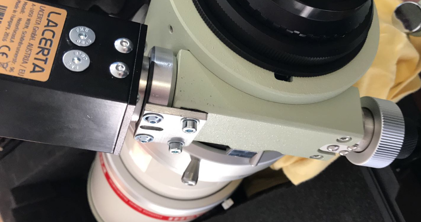 Mit diesem Montageset können Sie den Lacerta MFOC-Motorfokus problemlos an Ihrem Takahashi Okularauszug befestigen. Im Lieferumfang sind zwei Adapterplatten unterschiedlicher Länge enthalten, welche entweder zu Auszügen mit werkseitig verbauten Mikrofokus (FSQ-85ED, FSQ-106ED, TOA-150B) oder zum Standard-Auszug (z.B. TSA, Epsilon) passen. Zur Montage müssen bei ersterer Variante lediglich zwei Befestigungsschrauben der Fokus-Einheit am OAZ entfernt werden, sie werden durch die im Lieferumfang befindlichen, etwas längeren Schauben ersetzt, die halten dann den Motor mit ausreichender Festigkeit. Bei der anderen Version ohne Mikrofokus muss nur die zentrale Befestigungsschraube ersetzt werden, mit zwei Madenschrauben kann die Höhe der Platte exakt eingestellt werden. Es sind beide Montageplatten im Lieferumfang enthalten!