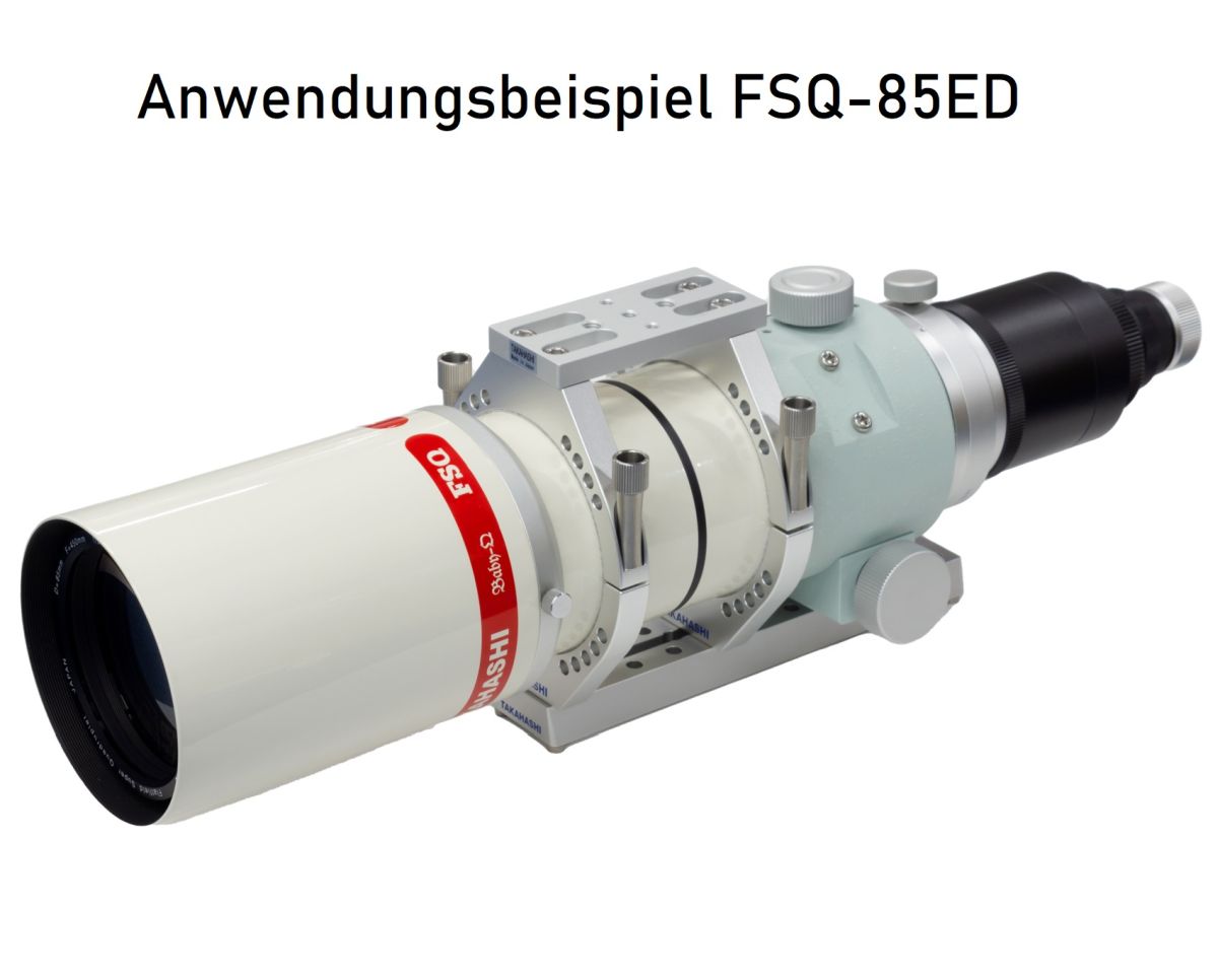 Diese Platte kann oben auf die neue Generation der Takahashi-Rohrschellen befestigt werden. Sie ermöglicht die einfache Montage von weiterem Zubehör, es sind z.B. zwei M8 Gewinde mit 35mm Abstand vorhanden, damit können die gängigen Takahashi-Rohrschellen direkt befestigt werden. Außerdem kann das Guidescope GT-40 montiert werden.