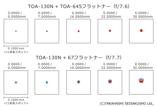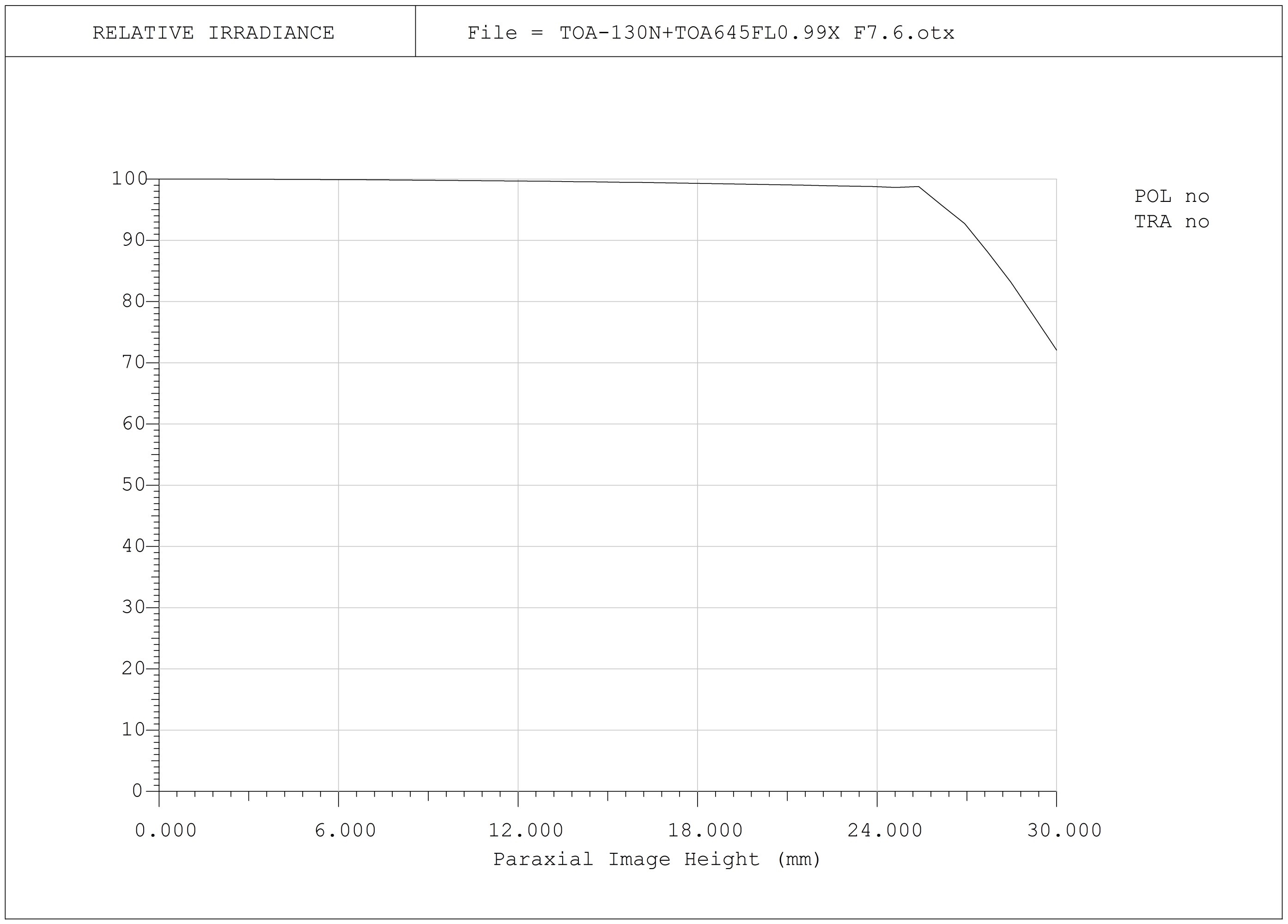 Dieser Flattener holt alles aus den TOA-Objektiven heraus, für eine bestmögliche Korrektur gibt es zwei unterschiedliche Sets für den TOA-130 und TOA-150, sie enthalten verschieden lange Kamera-Adapter. Die rechnerischen RMS-Spotgrößen sind beispiellos, 1 Mikron auf der Achse, 3my bei 43mm Bildkreis (Vollformat) und lediglich 5my bei 60mm! Das maximale Bildfeld ist kleiner als beim 67-Flattener, so extrem große Bildfelder werden im Zeitalter von digitalen Sensoren nicht, oder noch nicht benötigt, dafür ist die Korrektur im so wichtigen Bereich bis 50mm Durchmesser deutlich besser!