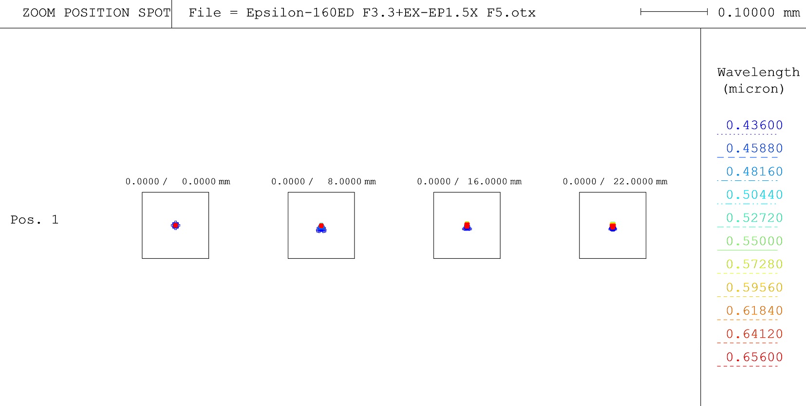 Dazu ist optisch ein hoher Bauaufwand erforderlich, der Extender ist mit 7 Linsen in 5 Gruppen aufgebaut. Er ist eigentlich als brennweitenverlängernder Komakorrektor zu verstehen, er korrigiert mindestens so gut wie der originale 2-linsige Korrektor, beim E-160ED sind das Spot-Größen von nur 1 Mikrometer auf der Achse und maximal 3 Mikrometer am Rand vom Vollformat. Auch die Ausleuchtung ist mit 60% bei Vollformat erfreulich gut. Er ist so konstruiert, dass sich der Fokus im Vergleich zum Korrektor nicht oder nur minimal verschiebt, ein vorhandenes Setup muss daher nicht neu konfiguriert werden!