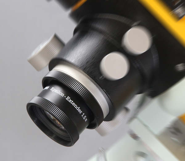 Takahashi ist es gelungen, für den kleinen Epsilon-130D einen Extender zu entwickeln, der die ausgezeichnete Sternabbildung auf der Achse wie im Feld beibehält. Die Brennweite wird um den Faktor 1.5x auf 650mm verlängert (f/5), daher ist der Epsilon auch für die Fotografie kleinerer Objekte geeignet, was das Einsatzspektrum deutlich erweitert.