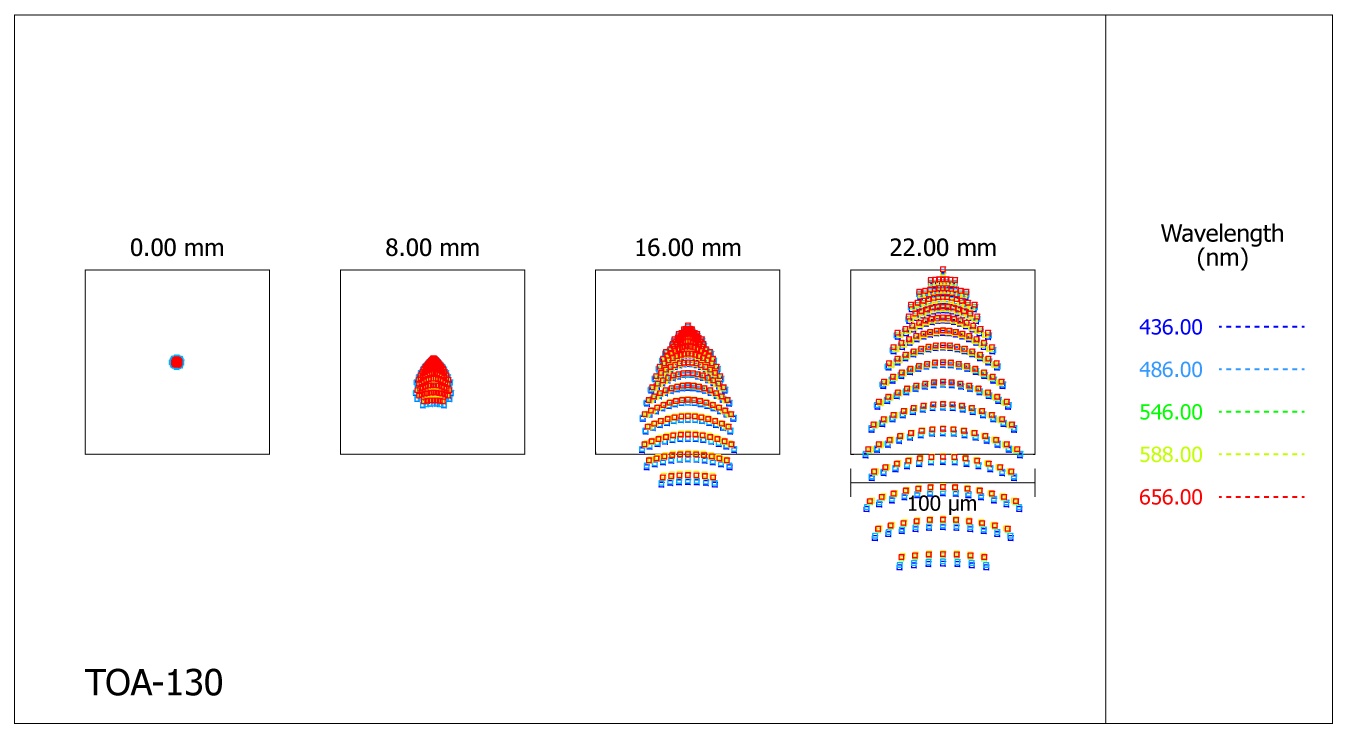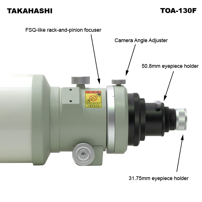 Die Teleskope der TOA-Reihe (TOA = Triplet Ortho Apochromat) sind sicherlich die besten Geräte ihrer Klasse, hier hat Takahashi das Optimum aus der Optik herausgeholt. Sie sind die farbreinsten Apochromate in diesem Öffnungs-Bereich am Markt und für das gesamte visuelle Spektrum, sowie für das angrenzende UV- und IR-Licht korrigiert, sie besitzen praktisch keinen Gaußfehler. Es sind Triplet-Objektive mit relativ großen Linsenabständen, die schwerere Bauweise und die etwas längere Auskühlzeit wird mit besserer Korrektur belohnt, neben dem FOA-60 zählen die TOA-Objektive zum Feinsten unter den Takahashi Teleskopen.