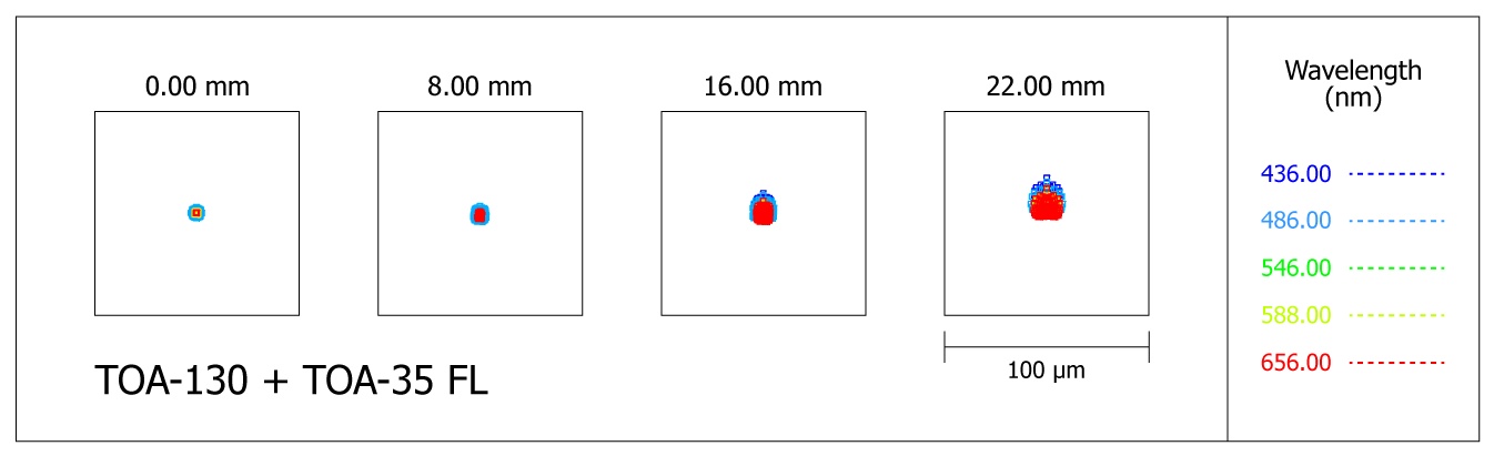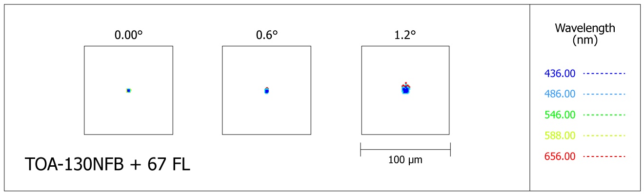 Die TOA-Optiken sind eine ausgesprochen leistungsfähige Basis für alle möglichen fotografischen Anwendungen, vor allem mit dem großen Flattener für das Pentax 67 Format (TKA31583S) oder dem neuen Super-Flattener für Pentax 645 (TKA31587S) gibt es auch für sehr große Sensoren passende Korrektoren, hier ist Takahashi eine Klasse für sich! Der 67-Flattener mit 92mm Bildkreis erzeugt in der Bildmitte 3 Mikrometer kleine Spots, am Rand vom 67er Format sind es maximal 20my, 100% Ausleuchtung bis 70mm Bildkreis (60% bei 92mm). Der Super-Flattener erreicht auf Achse die beste Korrektur aller Kombinationen und erzeugt 1 Mikrometer kleine Spots, 3my bei Vollformat und nur 5my bei 60mm Bildkreis!