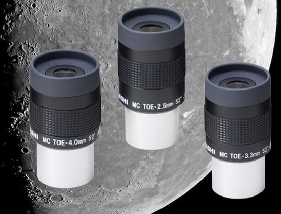 Die Takahashi TOE-Okulare ergänzen die LE-Serie im unteren Brennweitenbereich und ersetzen die beiden Hi-LE Okulare, die nur rund 40° Sehfeld hatten. Sie unterscheiden sich im optischen Aufbau von den LE, es handelt sich um eine 6-linsige Konstruktion, die LE (5-50mm) sind 5-Linser (2-1-2 System).