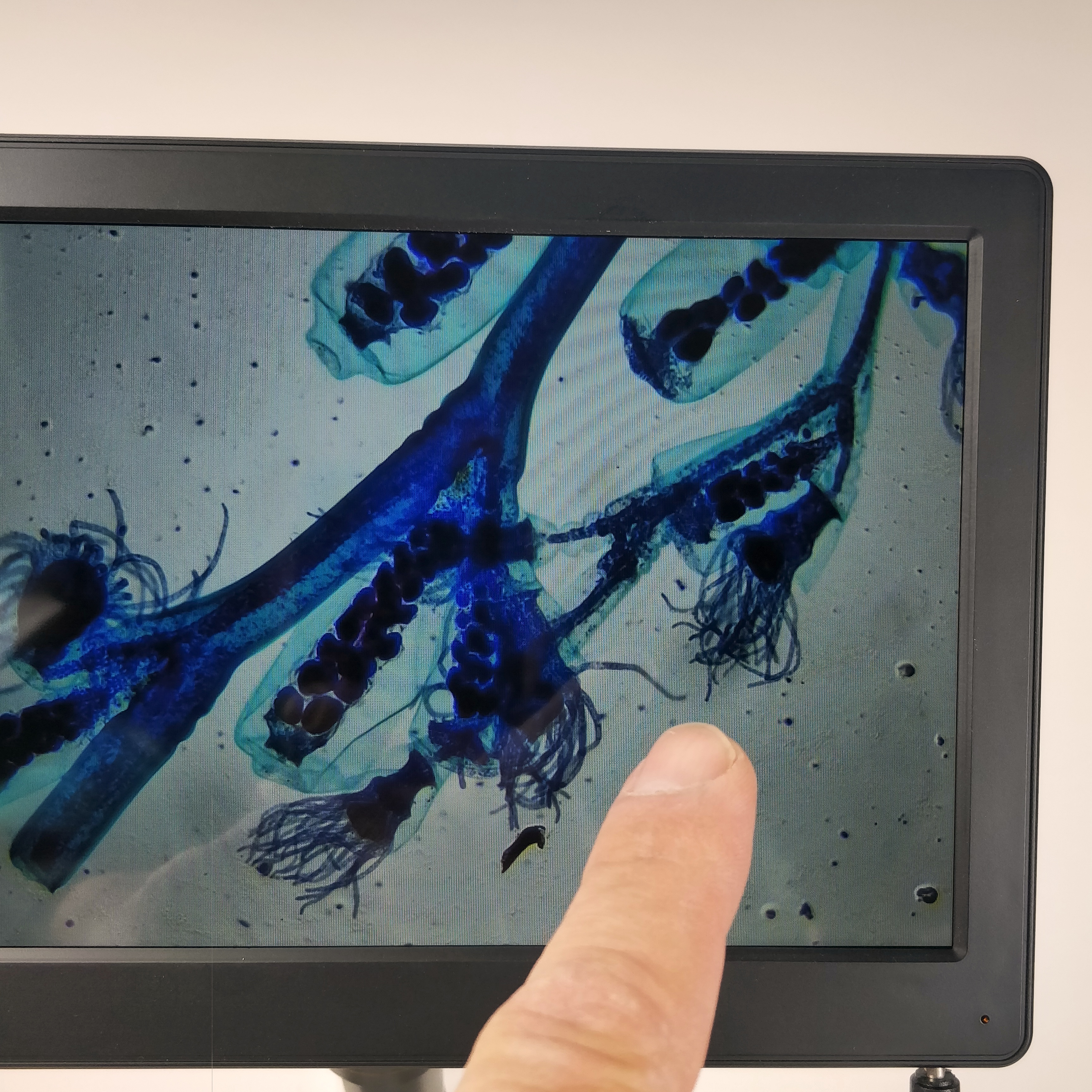 Vielleicht sagt aber noch mehr von der Qualität aus, was unseres Mikrokop NICHT hat. Unser Mikroskop hat keine Billig-Kunststoffteile, keine einfache Lochblende anstatt Kondensor, keine Billigobjektive welche bereits bei 40x Vergrößerung Abbildungsfehler zeigen. Es fehlt weder das Kreuztisch auch als das Mikrofokus-Feintrieb, und selbstverständlich wurde an das Größe des LCD-Bildschirmes mit 22.5cm Bildschirmdiagonale auch nicht gespart. Vor allem aber, braucht das Bildschirm bei Fotografieren nicht ständig berührt zu werden - deshalb entsteht auch keine defokussierte Unschärfe.