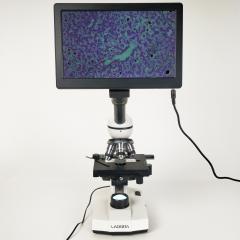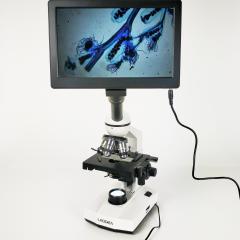Ein vollwertiges biologisches Mikroskop (mit Fix-Köhler Beleuchtung inkl. Abbe Kondensor, bis zu 1000x Vergrößerung, LED-Lichtquelle, Kreuztisch mit Messskala und Feinbewegung, Mikrofokus-Scharfstellung) kombiniert mit in einen 22.5cm LCD-Bildschirm integrierte HDMI Videokamera und Fotoapparat (Steuerung sowohl mit eigenem Operations System als auch durch Computer, integrierter micro-SD Card als Datenträger), inkl. Fernauslöser durch Maus.