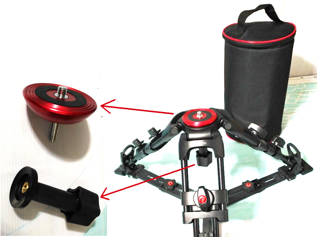 An der Stativ-Oberseite ist eine spezielle Plattform zur Nivellierung der Kamera bzw. des Zubehörs integriert (siehe Foto links). Das Anschluss-Gewinde für das Zubehör ist das 3/8" Fotogewinde.