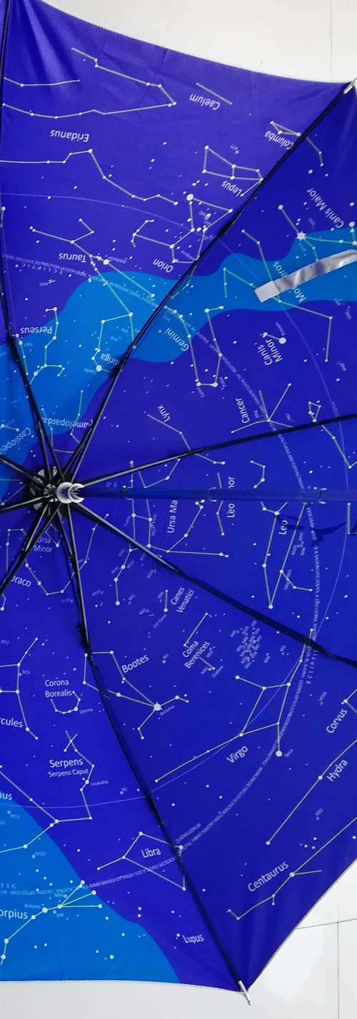 Innen: Sternkarte bis 4 Magnitudo, inkl. Milchstrasse und heller Messier Objekte, Astrolampen-taugliche Farben (Blaustufen).