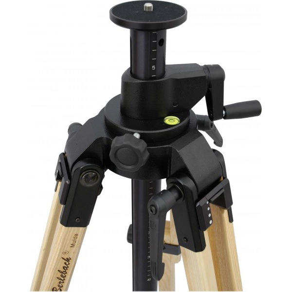 Leichtmetallschenkelkopf mit Kurbelmittelsäule und Dosenlibelle. Mittelsäule 50 cm lang (Verstellweg 39 cm). Schrägverzahnung der Mittelsäule wirkt als automatische Säulenbremse.
