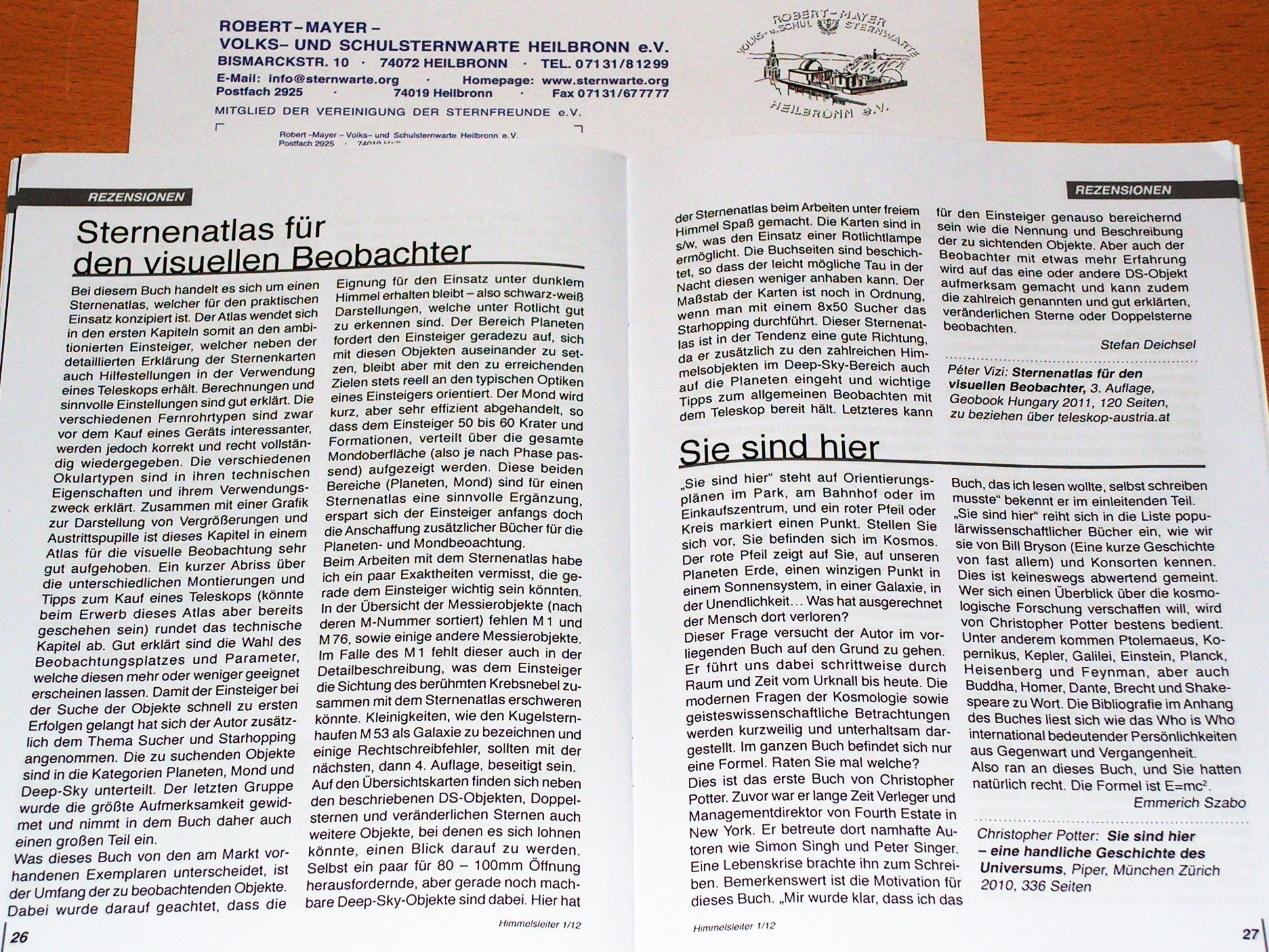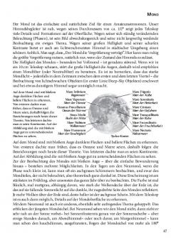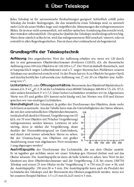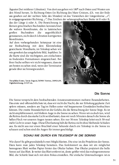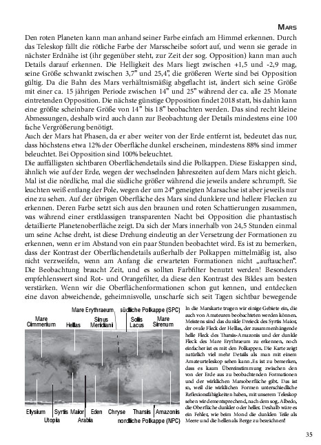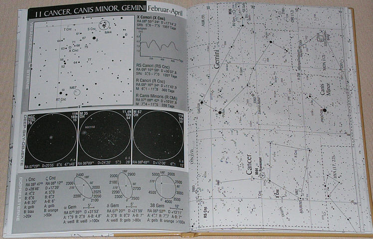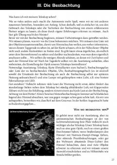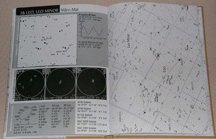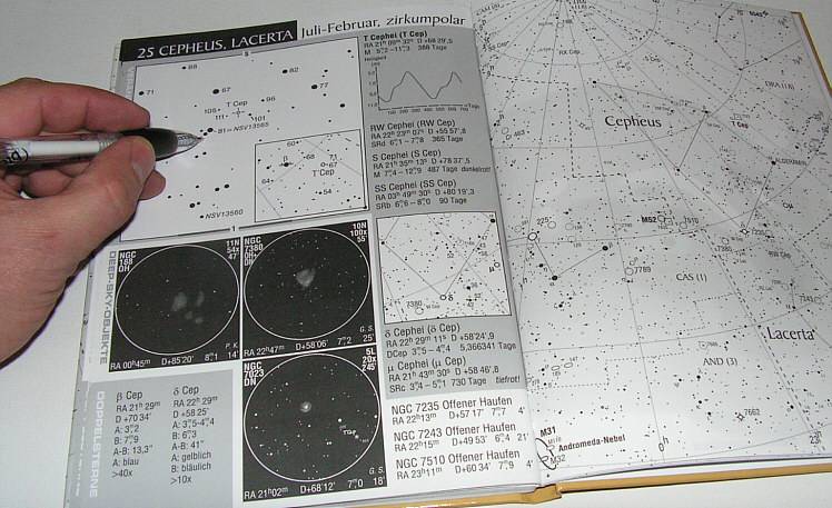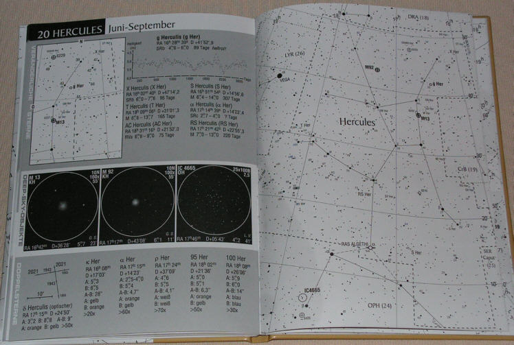 Links von den Kartenblättern stehen die wichtigsten und auch weiterführende Informationen über die Objekte, samt Detailkarten. Die Bleistift-Zeichnungen, welche ausschliesslich mit Kleinteleskopen oder Ferngläsern gefertigt wurden, geben einen Eindruck von der visuellen Sichtbarkeit. So bekommen Einsteiger eine Idee davon, was sie von ihren Geräten erwarten können. Die Einleitung enthält eine Menge wichtiger Tricks und Tipps für die Verwendung des Teleskopes. Der Sternatlas zeigt den ganzen Himmel, welcher von Europa aus sichtbar ist. Dank des gut durchgedachten Zeichensystems, ergänzt durch die Milchstrassendarstellung in Graustufen, ist die Orientierung für Einsteiger leicht und doch informativ.