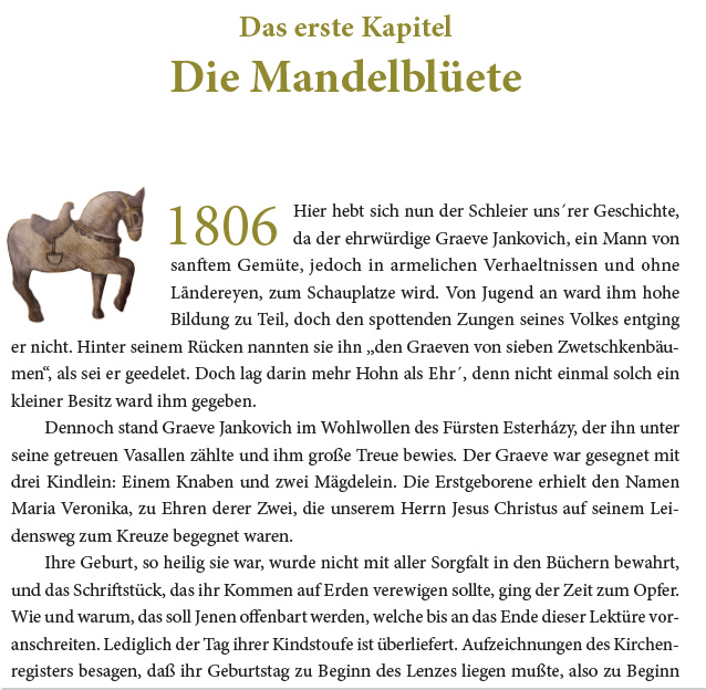 1825: Vor ziemlich genau 200 Jahren befinden wir uns innerhalb der uralten Mauern der Burg von Tata und an den romantischen Hügeln des Gerecse-Gebirges. Wir werden Zeugen der verborgenen Liebe zwischen Veronika, der schönsten Frau des Komitats, und dem Paradekutscher des Hofes. Ihre mutige Entscheidung – die Flucht und die geheime Hochzeit – veränderte ihr Leben für immer.