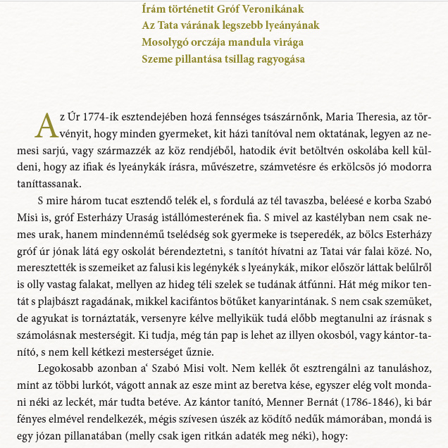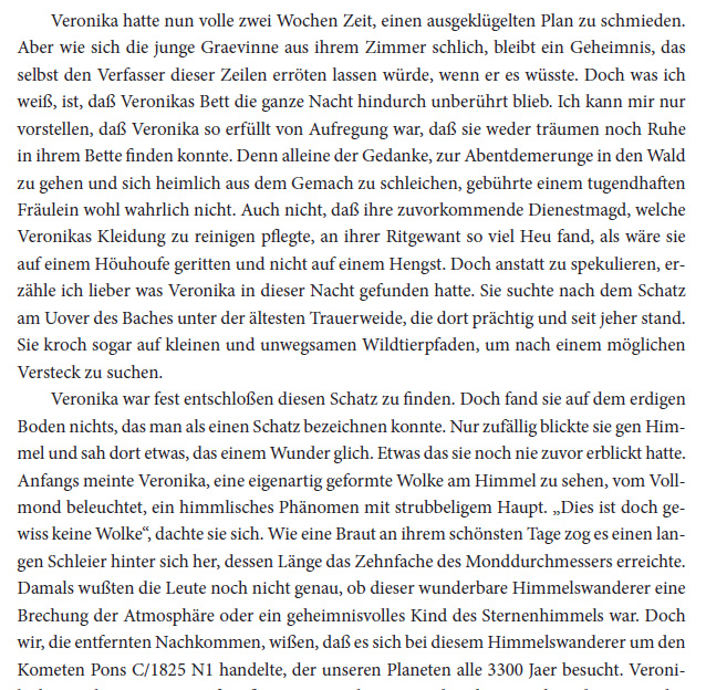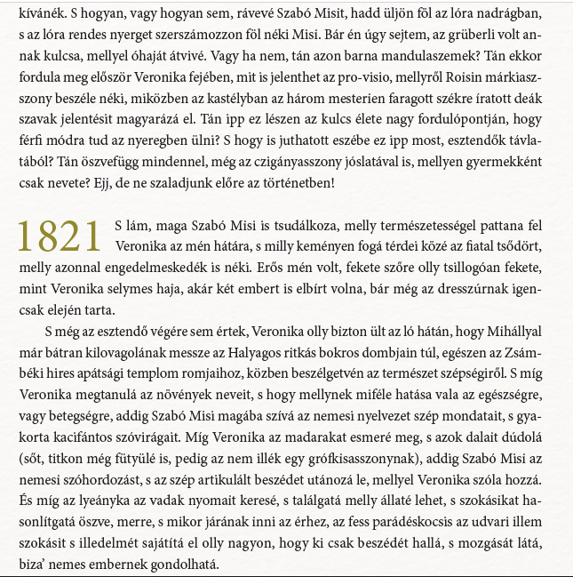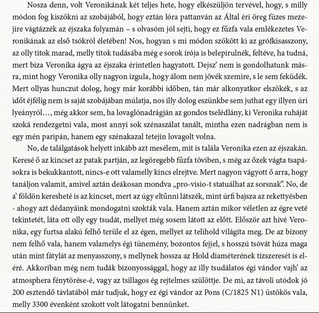 Parallel zur Legende wurden die bedeutendsten astronomischen Phänomene jener Zeit (der Komet C/1825 N1 Pons, der Leonidenstrom von 1833 und der Große Märzkomet von 1843), sowie botanische Besonderheiten festgehalten. Das Buch wird mit ganzseitigen Astro-Landschafts-Fotos illustriert, die von Veronikas Urenkel, Lajos Szánthó, aufgenommen wurden. Die begleitenden Grafiken stammen von Ágnes Szánthó, einer weiteren Urenkelin der entführten Gräfin.