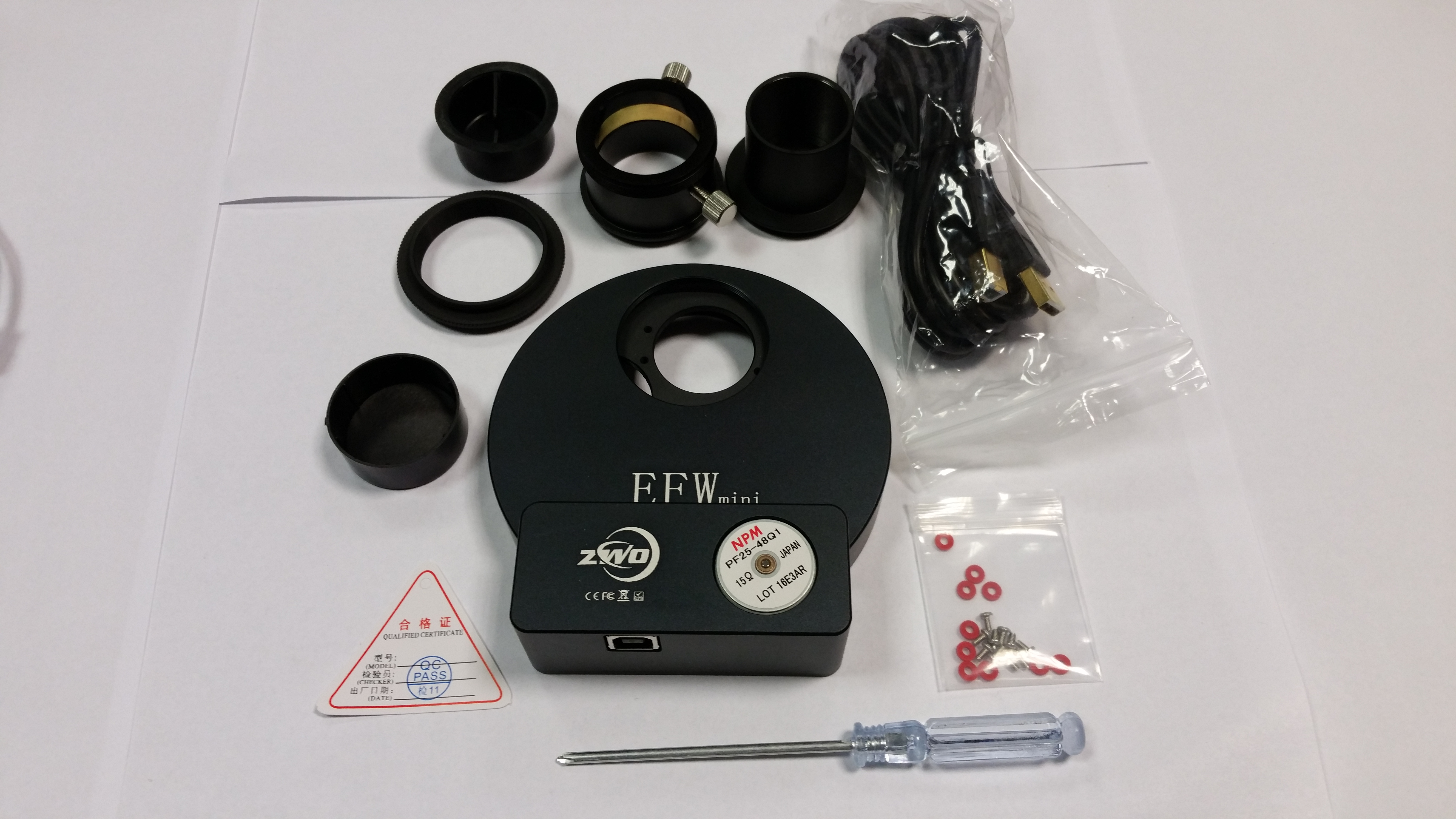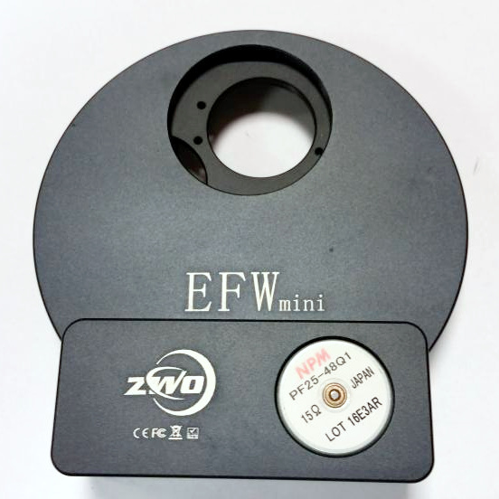Das kleine und leichte ASI mini Filterrad hat beiseitigen T2neg. Anschluß. Es können 5x 1,25" oder 31mm ungefasst Filter verbaut werden. Die Ansteuerung erfolgt über USB via Ascom kompatiblem programm.
