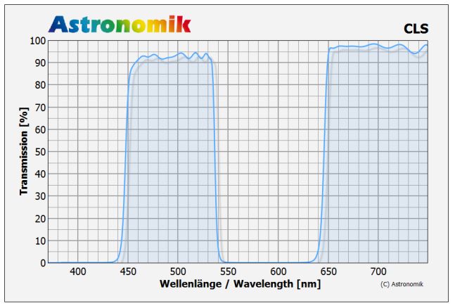 Der CLS Filter erhöht den Kontrast zwischen astronomischen Objekten und Himmelshintergrund. Durch die große Halbwertsbreite wird eine entsprechend große Lichtmenge durchgelassen, Sterne werden so nur gering abgeschwächt. Der CLS Filter ist darauf ausgelegt, möglichst viel Störlicht zu blocken und dabei trotzdem möglichst viel Licht der Objekte durchzulassen.