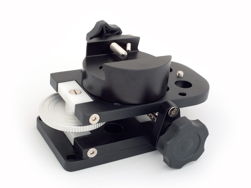 An der Oberseite ist eine Vixen Level Prismenklemme vorhanden, hier können kleinere Teleskope befestigt werden. Es können Geräte bis ca. 5kg montiert werden, entfernt man die Vixen Klemme, kann auch Zubehör mit 1/4 Zoll Anschluss befestigt werden, eine passende Schraube ist dabei. Die Montage an der Unterseite kann entweder über das zentrale 1/4 Zoll Innengewinde, oder über vier Bohrungen in den Ecken für metrische M5-Schrauben erfolgen.