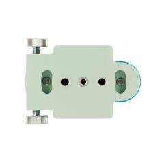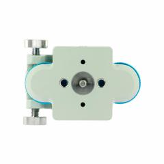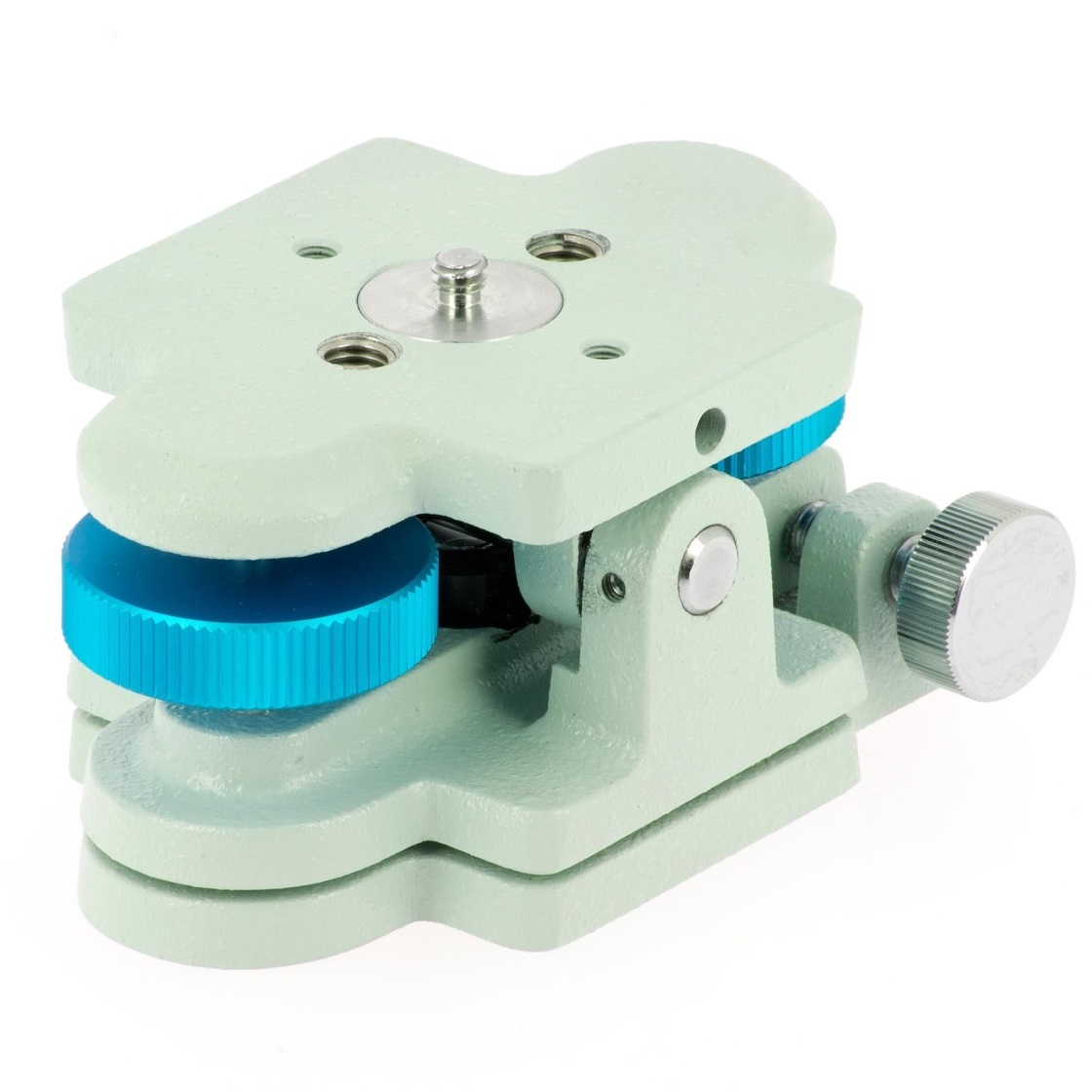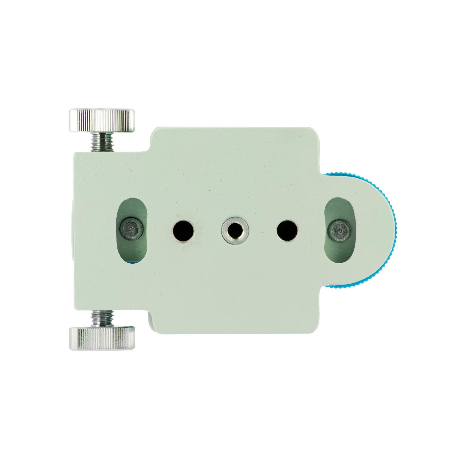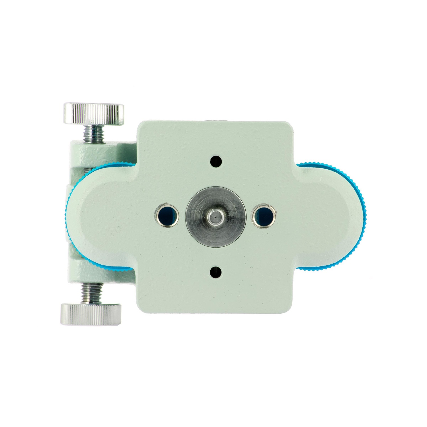 Der Anschluss unten ist ein zentrisches 1/4" Innengewinde, zusätzlich sind auch zwei M6 Innengewinde im Abstand von 35mm vorhanden. Oben ist ein 1/4" Außengewinde auf einem herausnehmbaren Inlay (durch Madenschrauben fixiert) für Kameras oder leichte Zubehöre vorhanden. Zum Anschluss von Takahashi Rohrschellen, zusätzlich auch zwei M8 Innengewinde im Abstand von 35mm.
