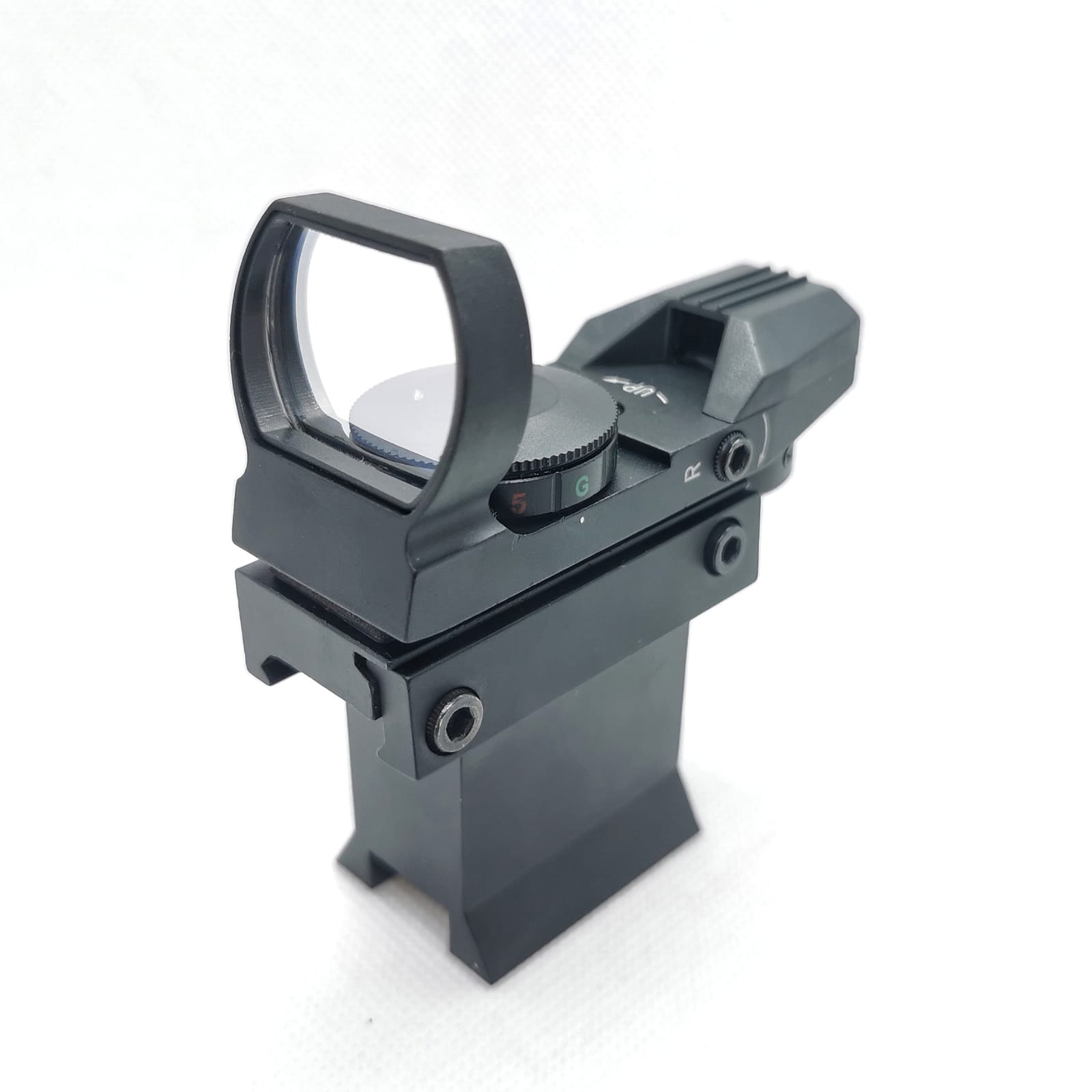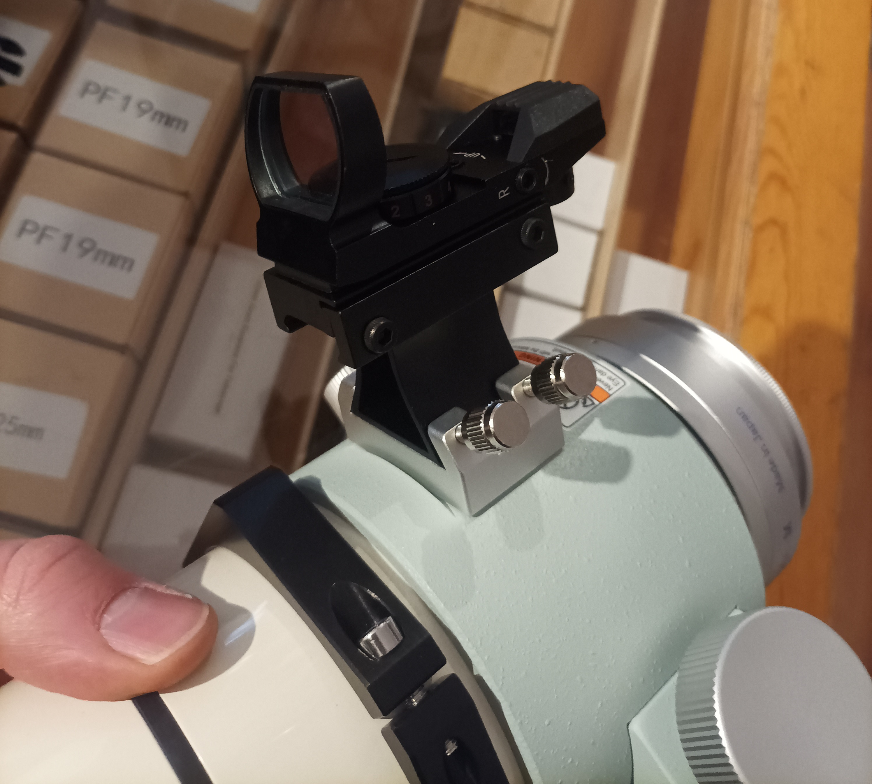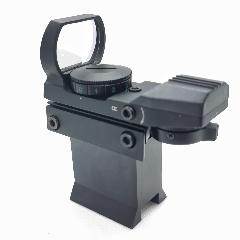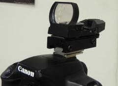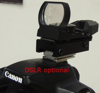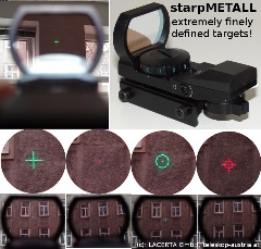 Dieser hochwertige Starpointer hat vier verschiedene (und sehr scharf definierte) Zielmarkierungen: Punkt, Punkt im Kreis, Kreuz, Kreuz im Kreis. Der Leuchtpunkt ist rot, und die Helligkeit ist einstellbar.