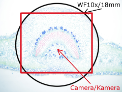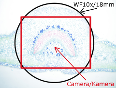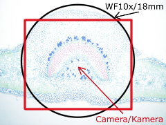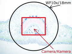 Die Kamera wurde auf automatischer Beleuchtung und Weissabgleich eingestellt um zu sehen, wie sie reagiert, wenn die Präparate einmal mit optimaler, einmal mit minimaler Lichtstärke beleuchtet werden. Das wenig Licht kompensierte die Kamera automatisch mit längeren Expositionszeiten und höheren Gain-Werte, die Qualitätsunterschiede treten beim Betrachten des Bildrausches in Vorschau. Die Qualität einer Kamera ist umso besser, desto weniger Unterschiede (Bildrausch, Kontrast, Farbechtheit) zwischen optimal und unterbeleuchtete Testfotos zeigt (für die volle Auflösung bitte ans Bild klicken!). Beachten Sie auch die Größe des abgebildeten Feldes: das visuelle Gesichtsfeld durch einem 10x/18mm Okular ist mit schwarzem Kreis markiert.