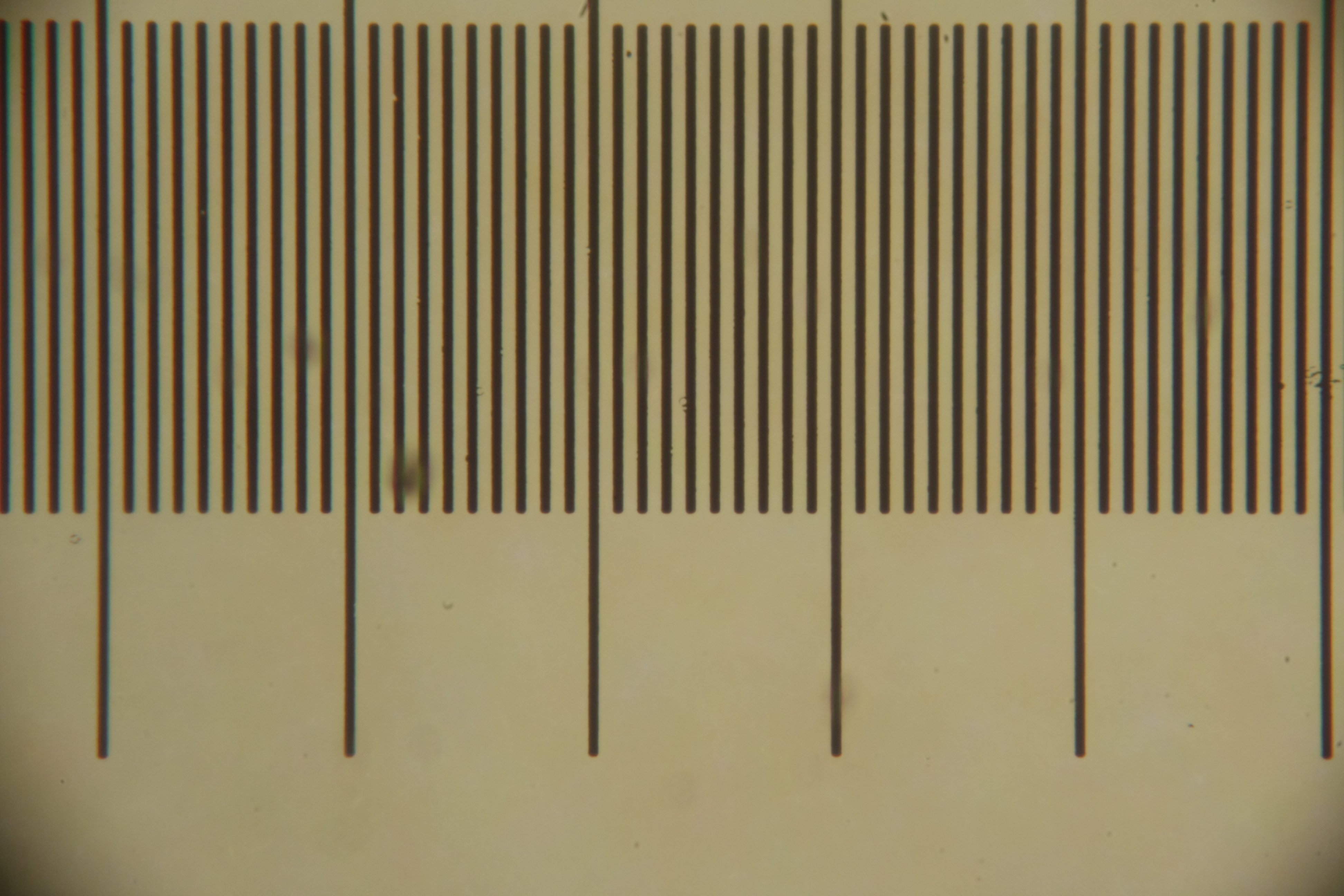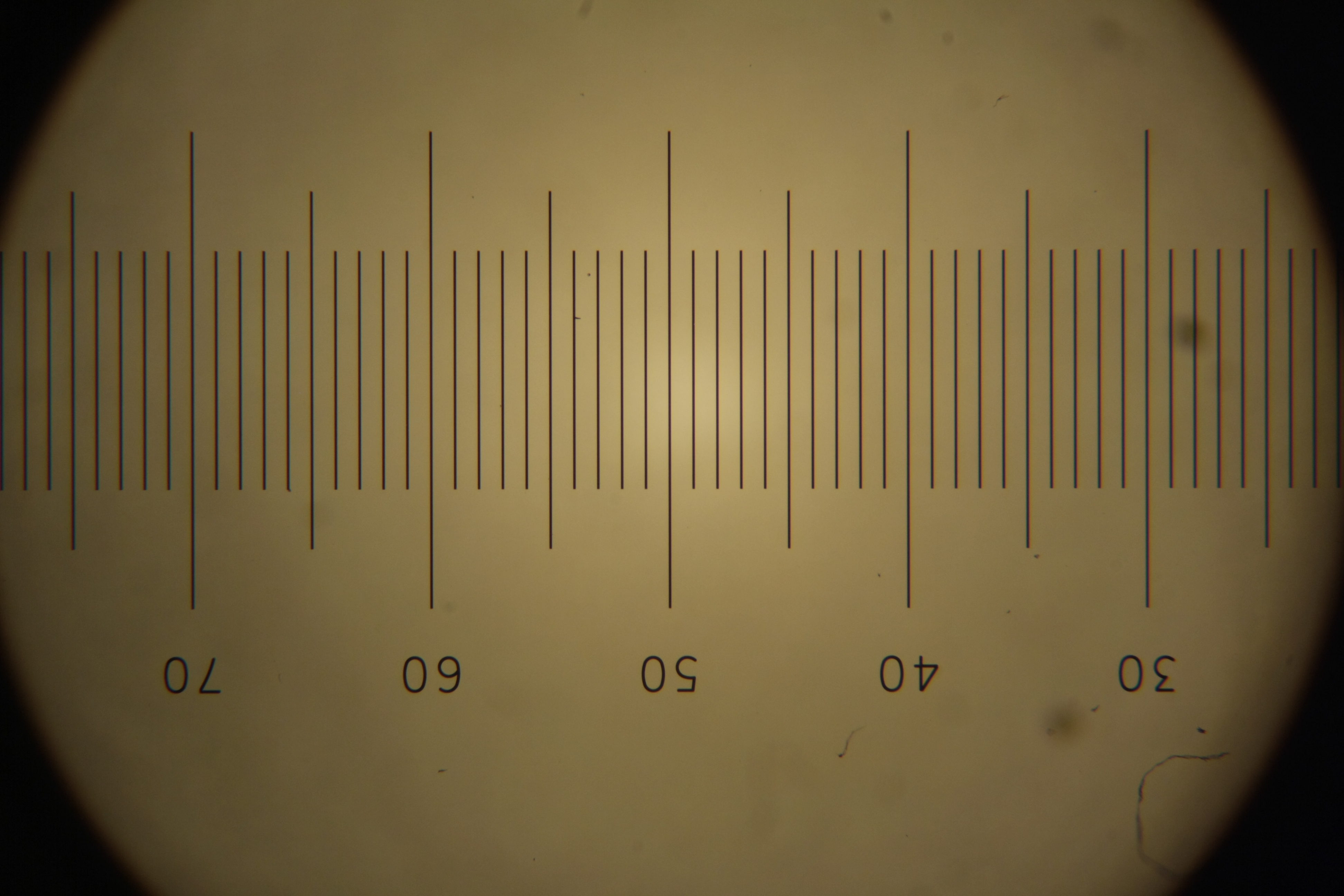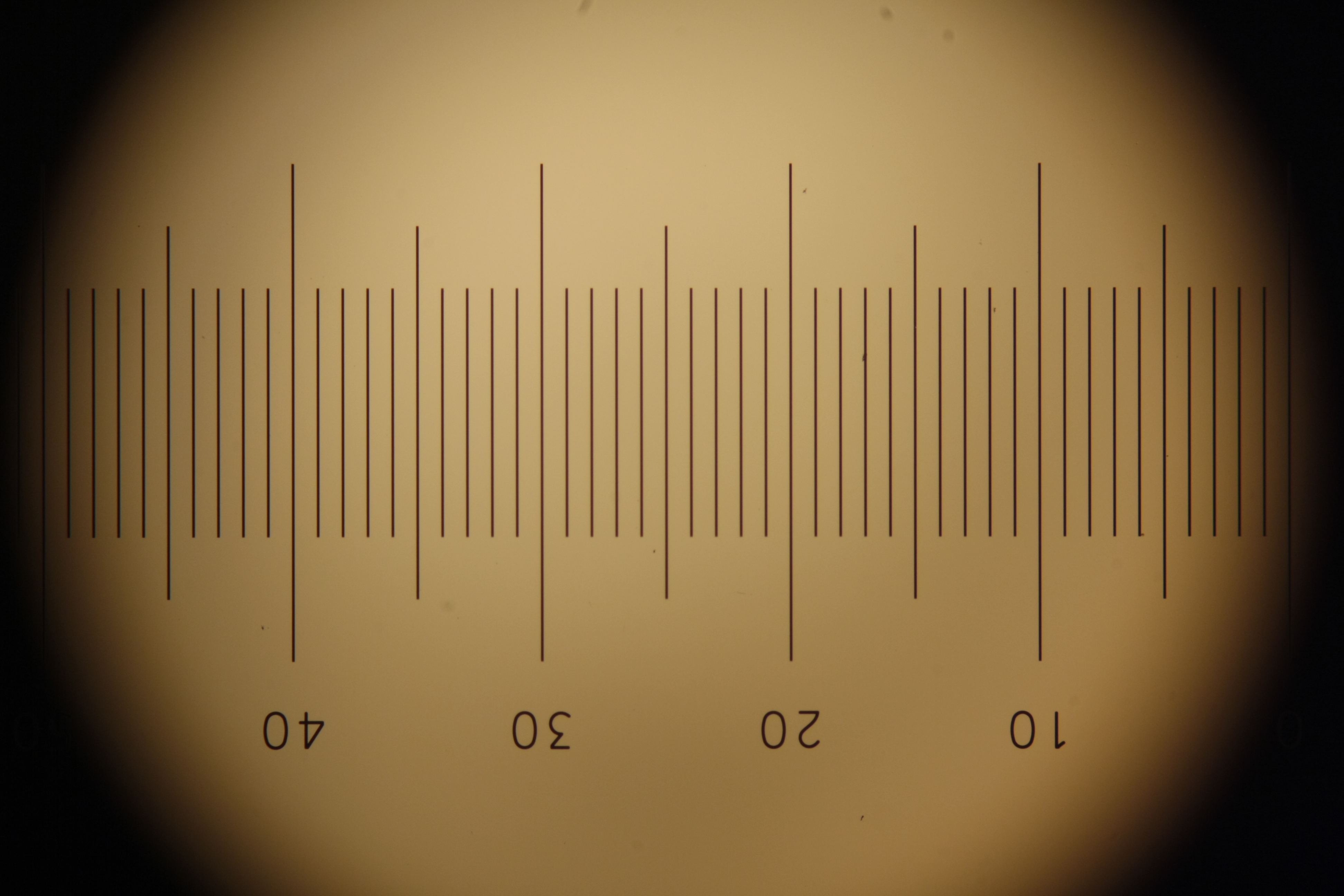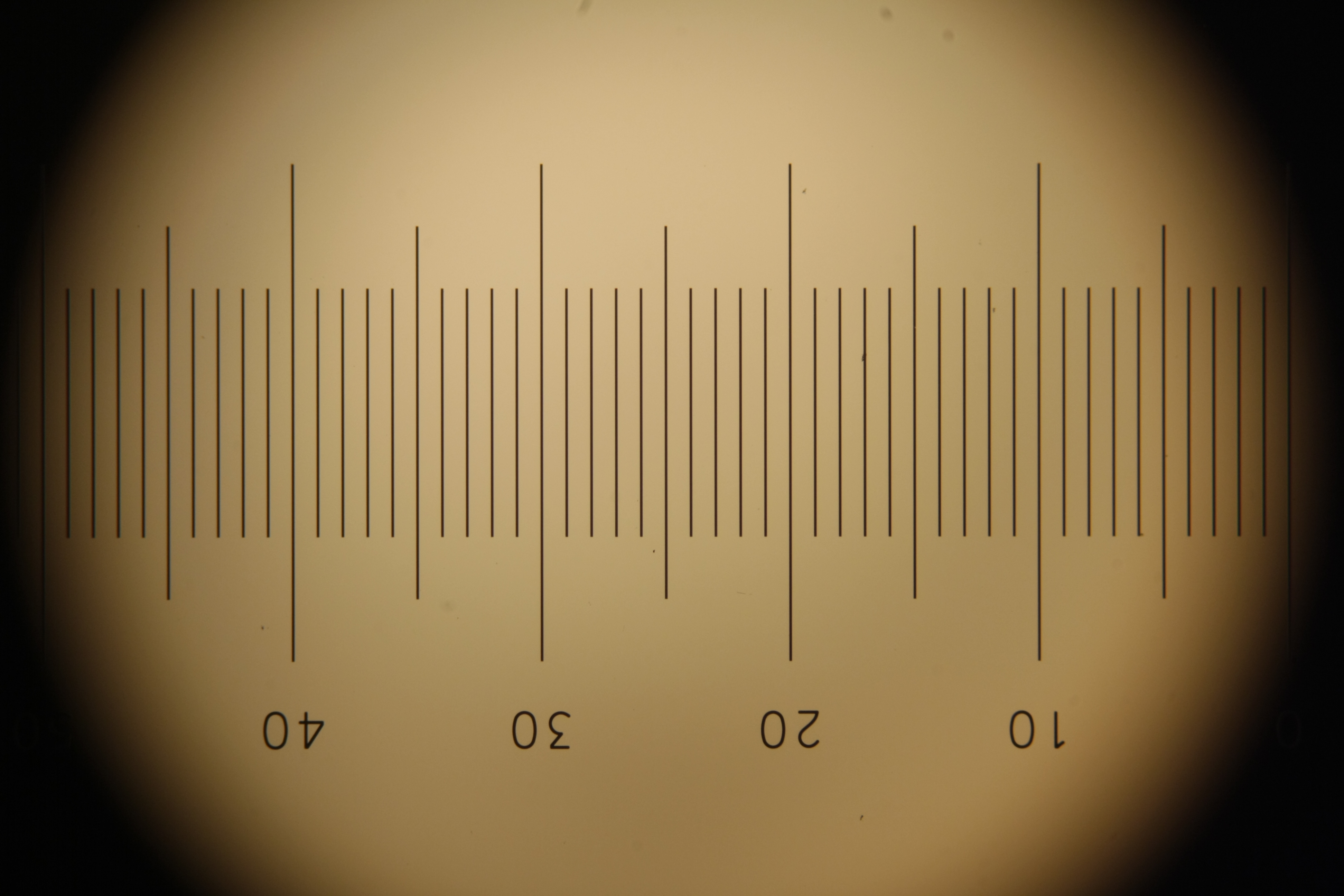 Mikroskoptest mit 0.1mm und 0.01mm Kalibrationsplatte