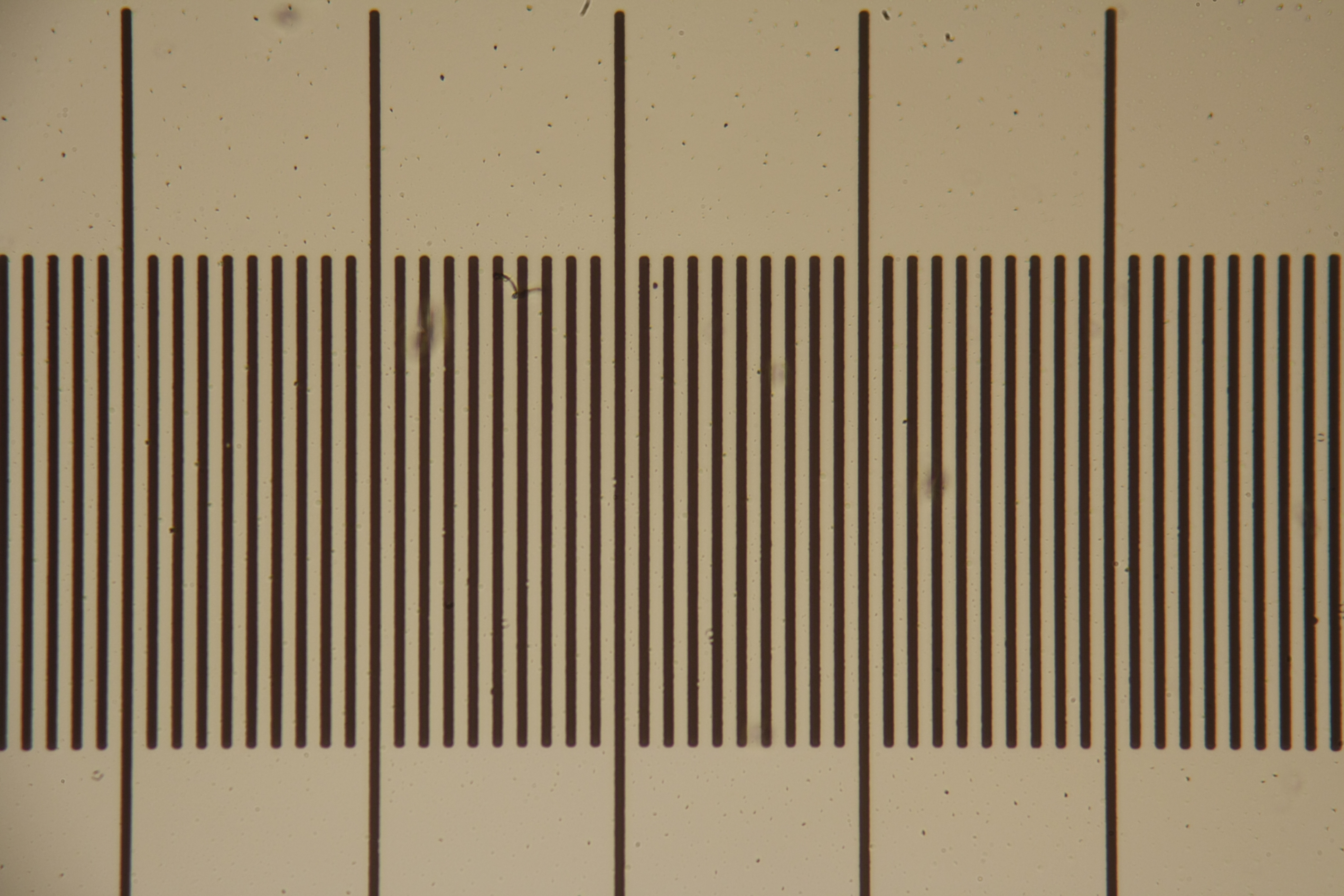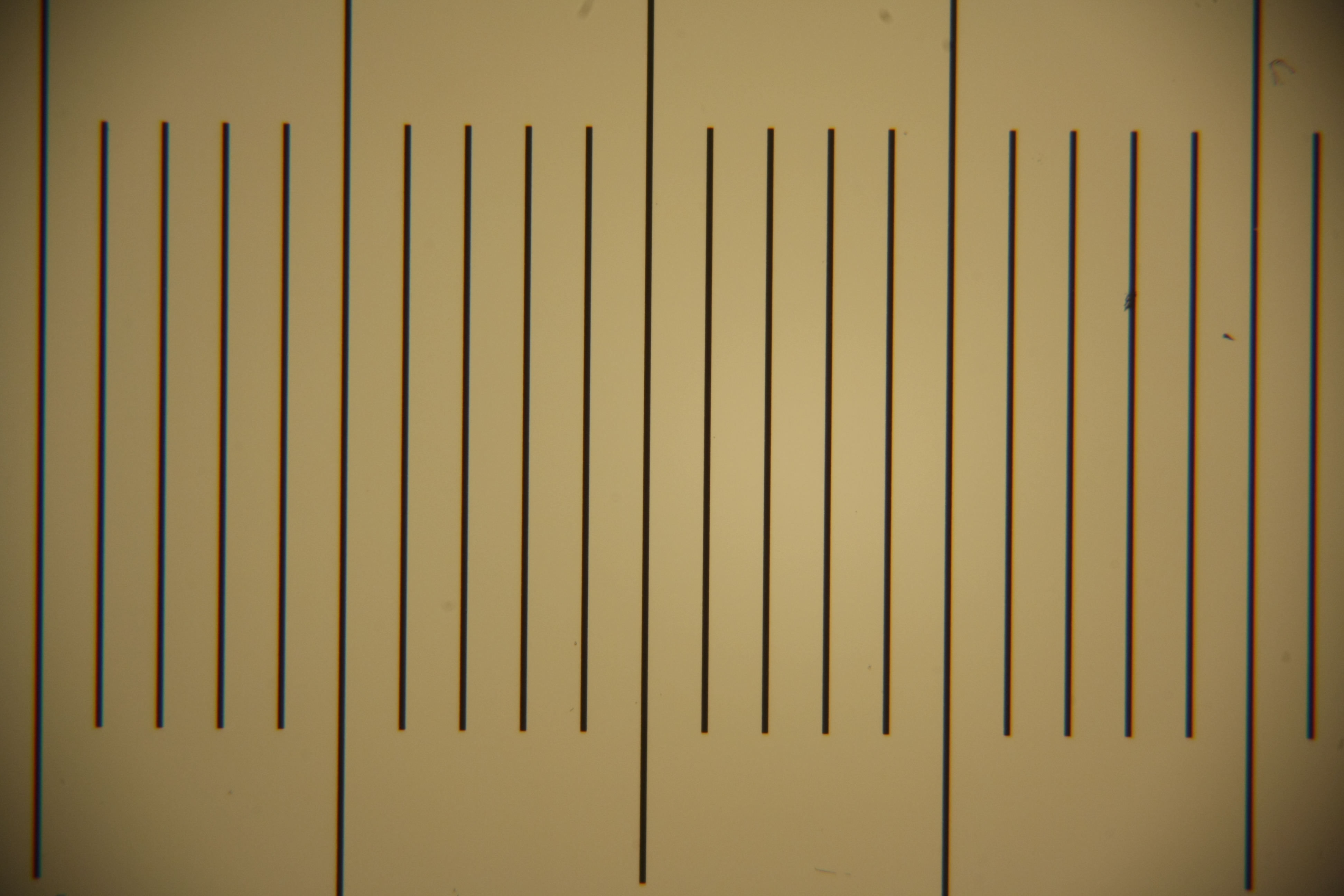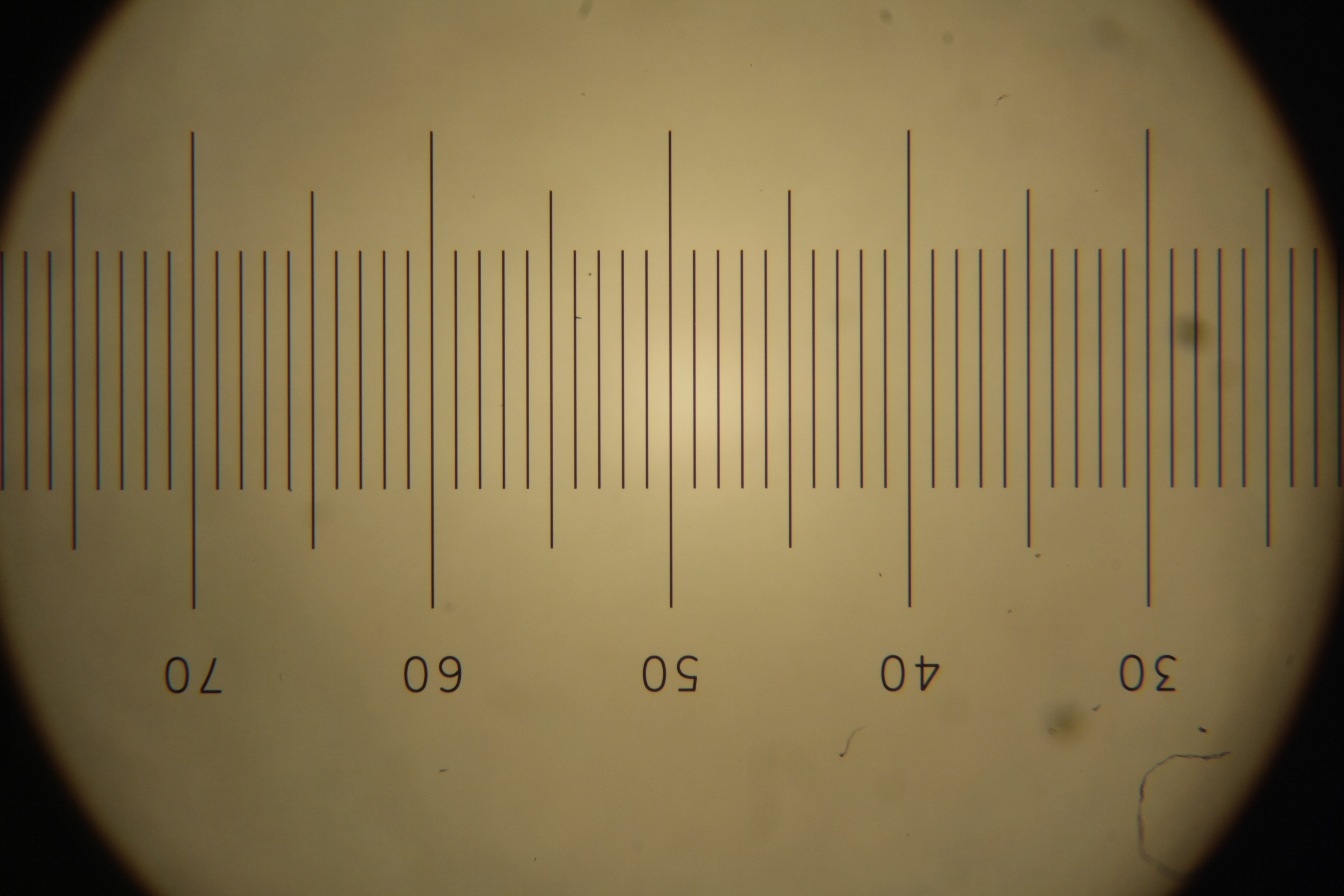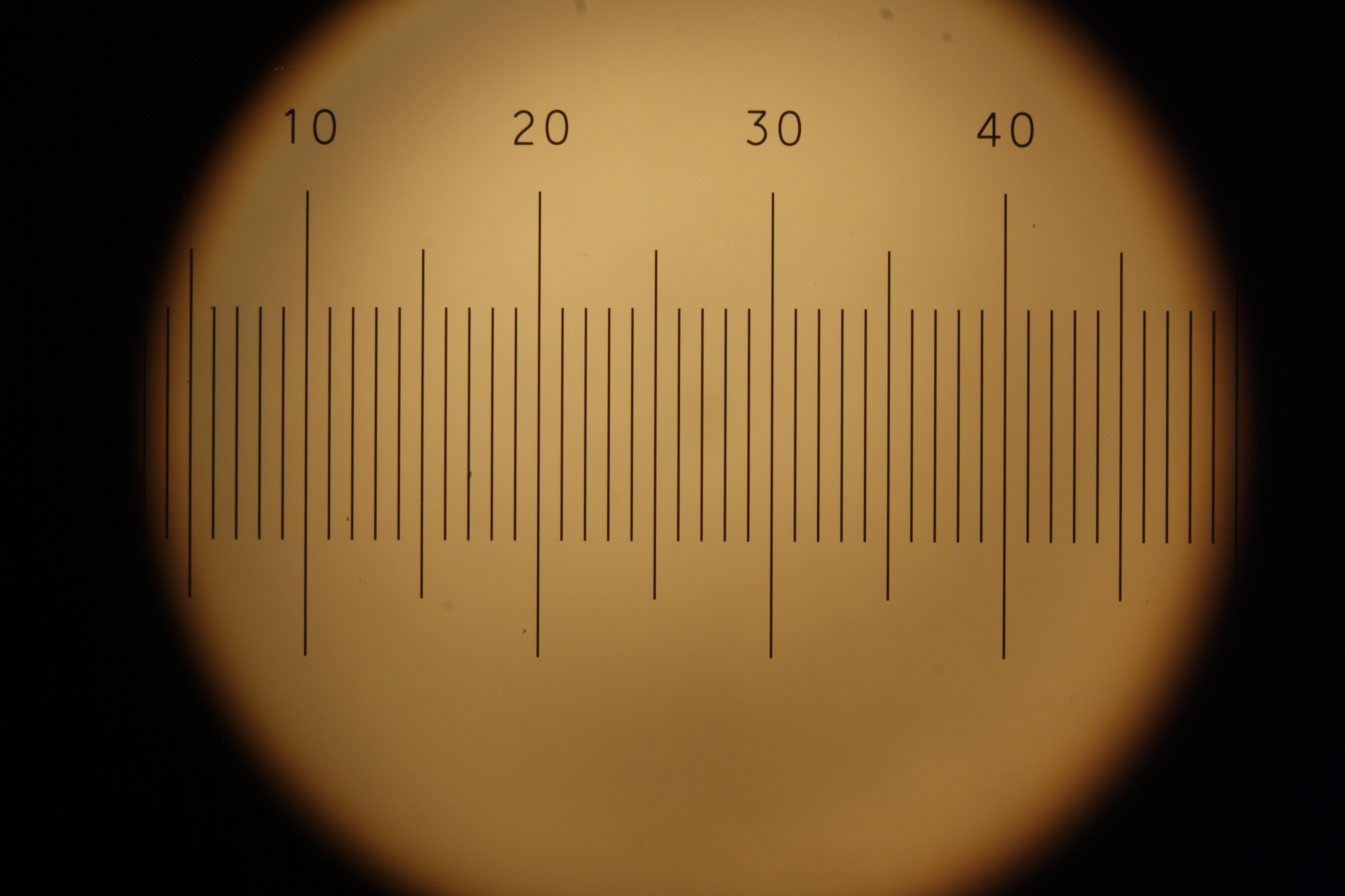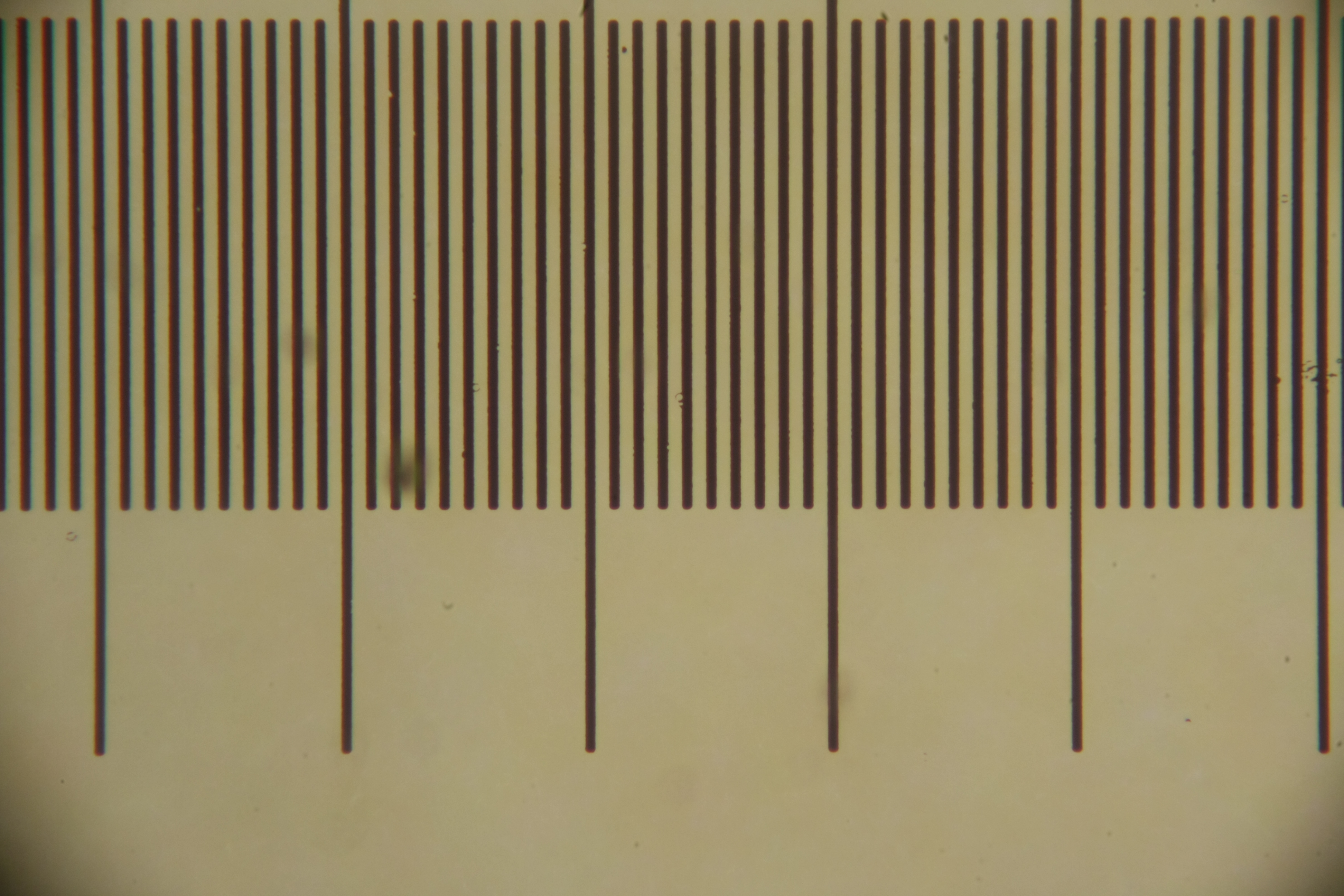 Mikroskoptest mit 0.1mm und 0.01mm Kalibrationsplatte