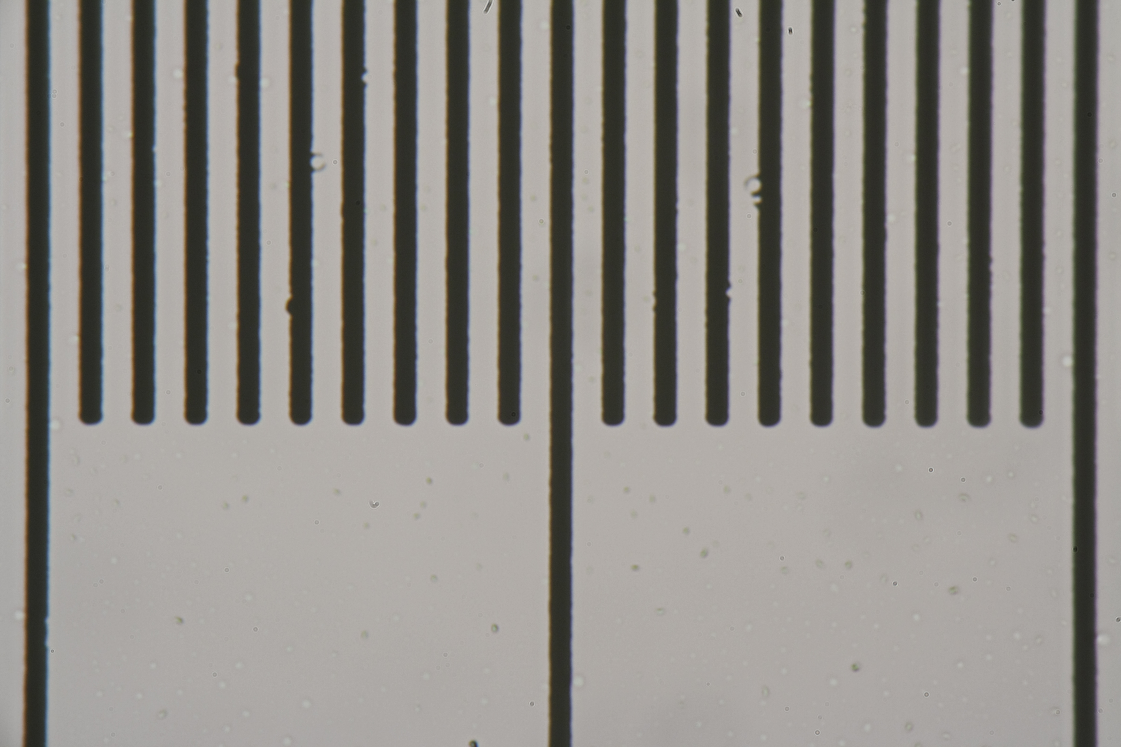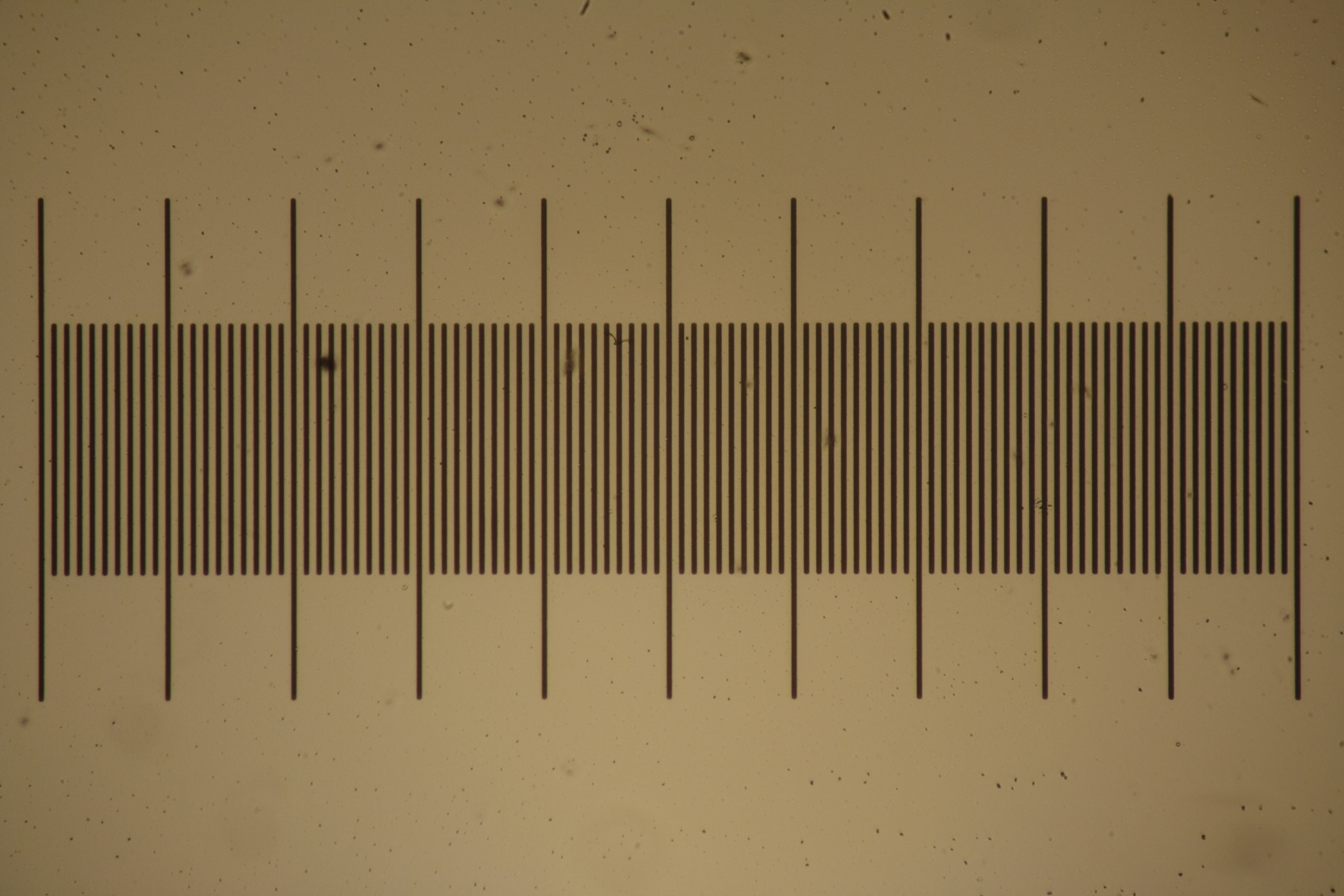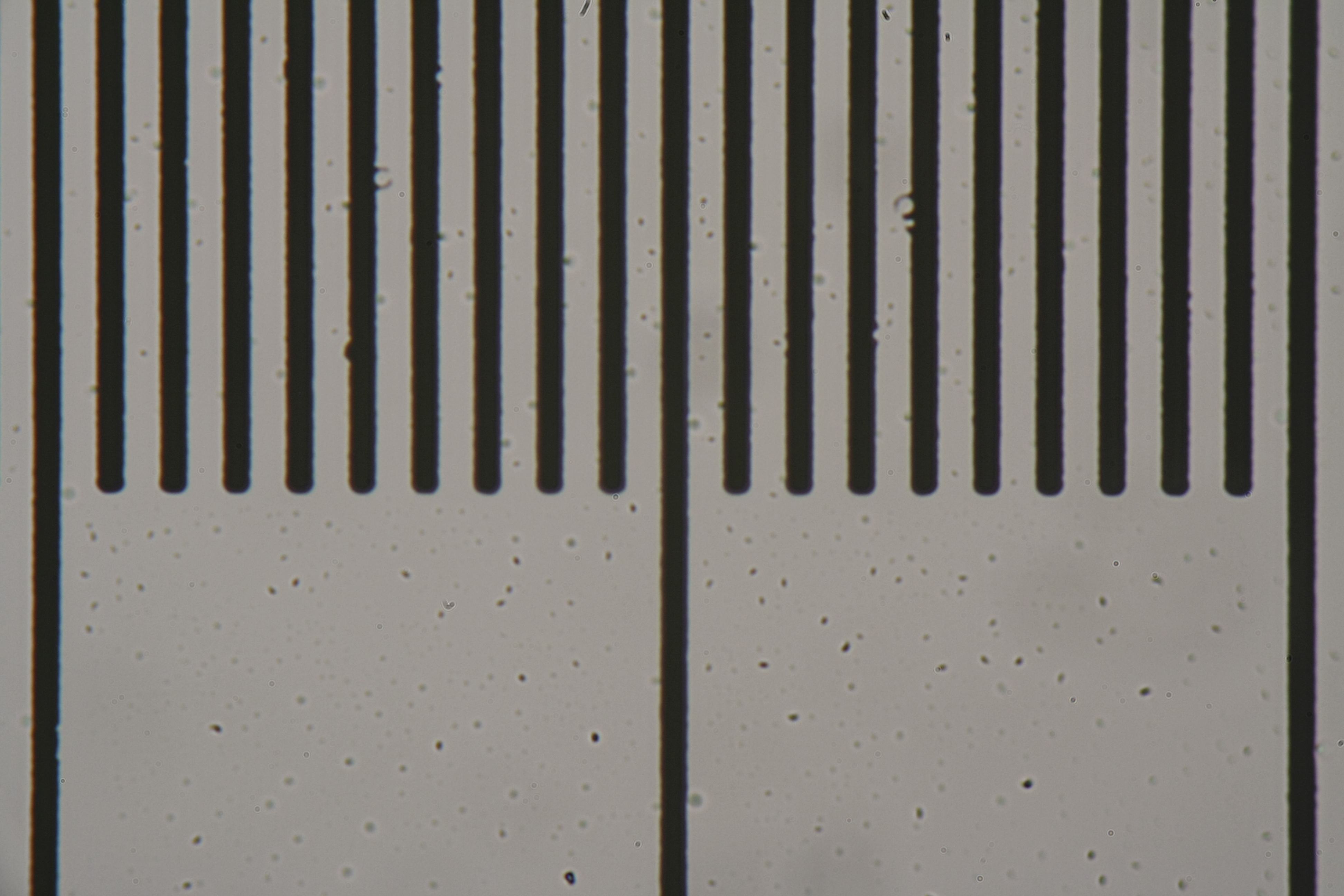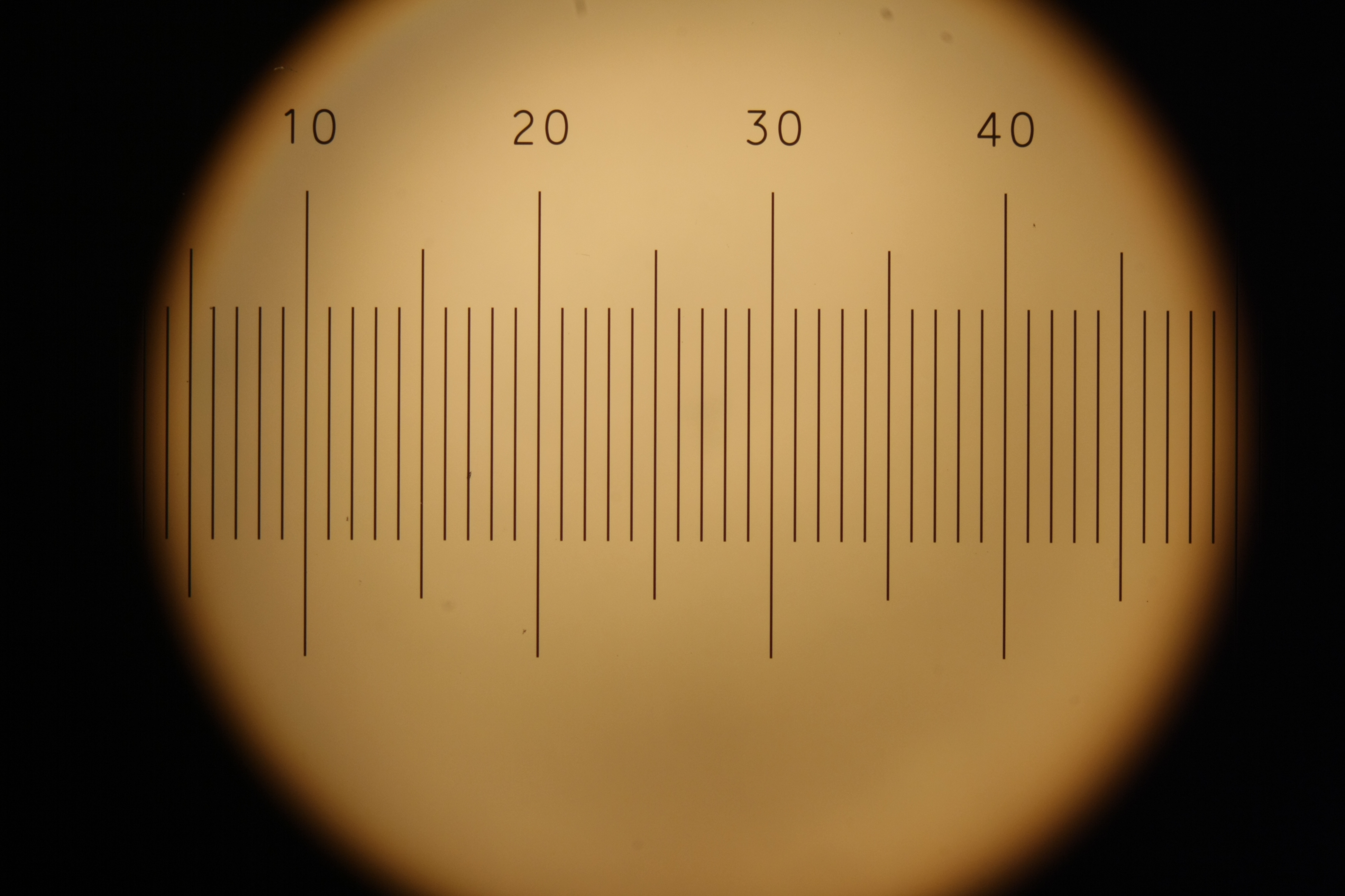 Mikroskoptest mit 0.1mm und 0.01mm Kalibrationsplatte