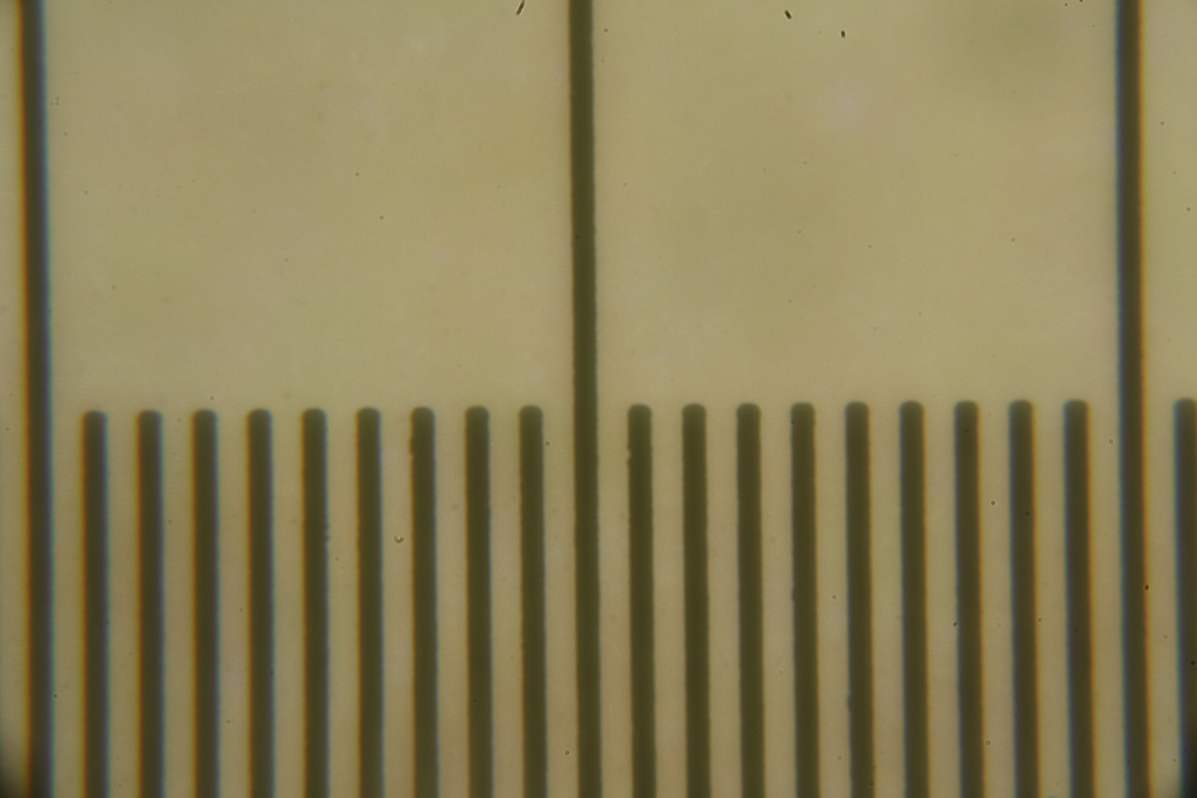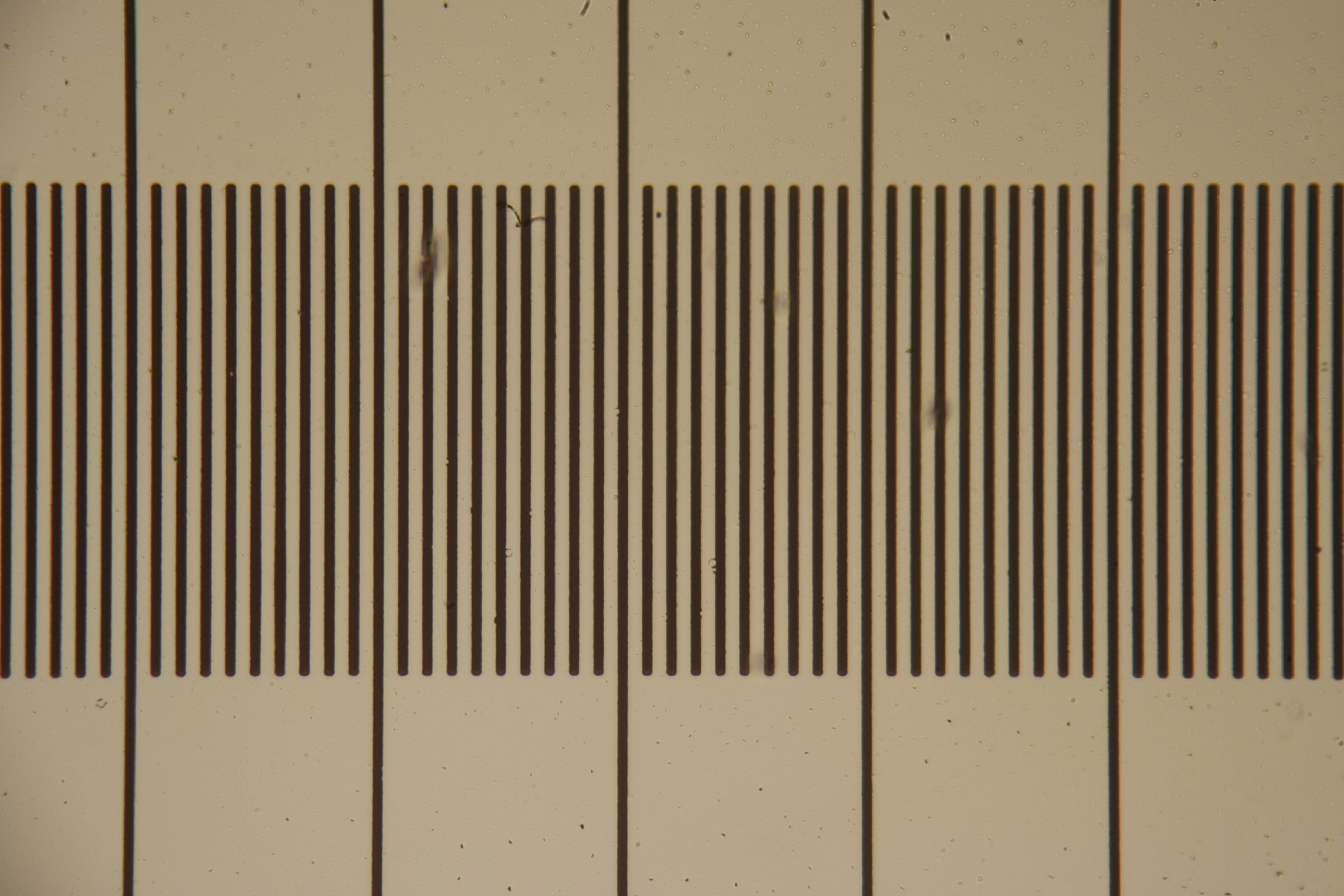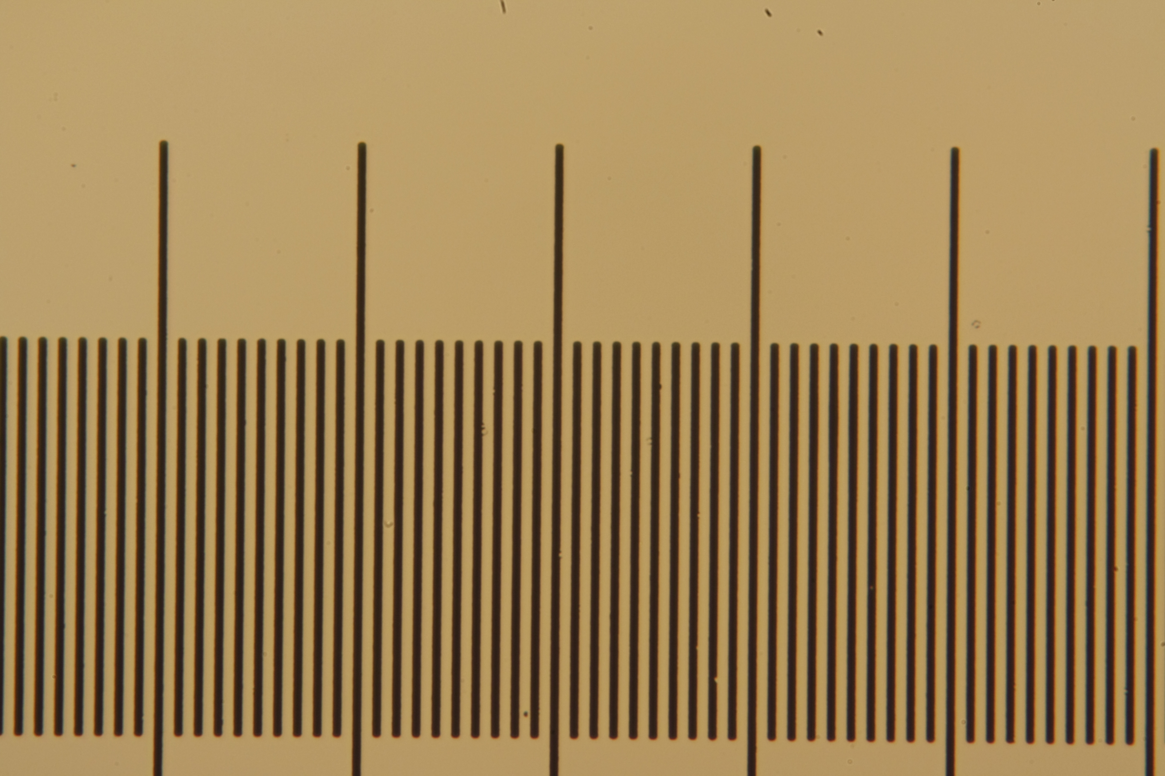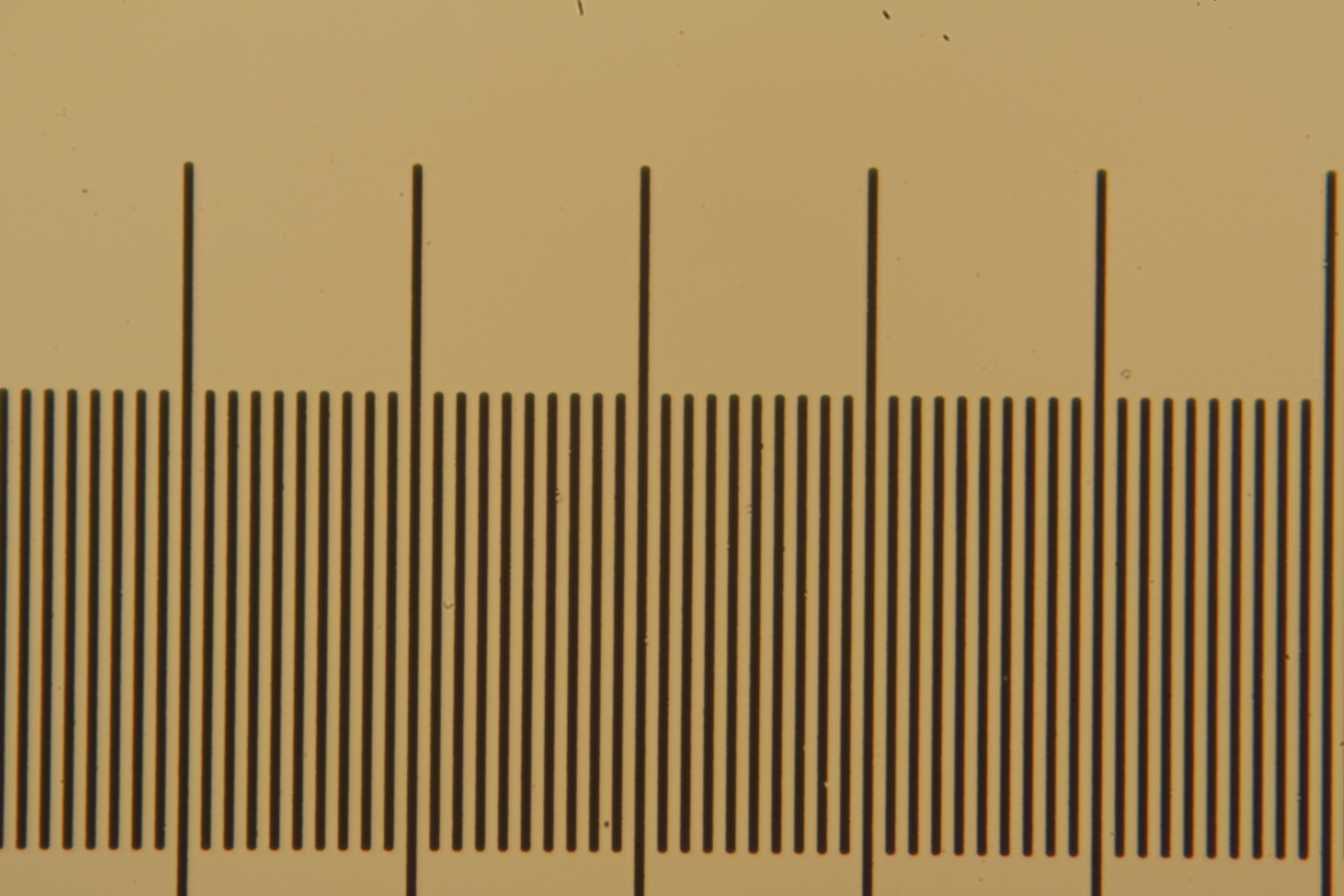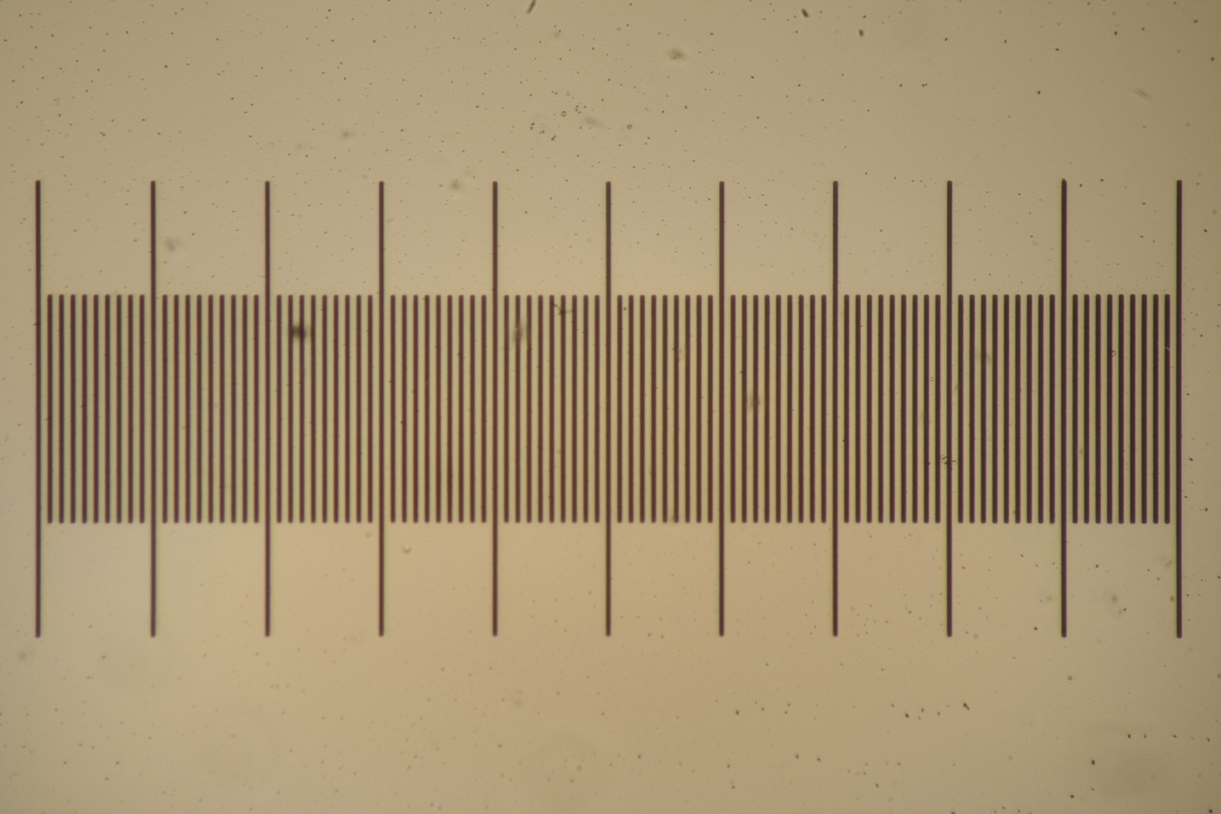 Mikroskoptest mit 0.1mm und 0.01mm Kalibrationsplatte