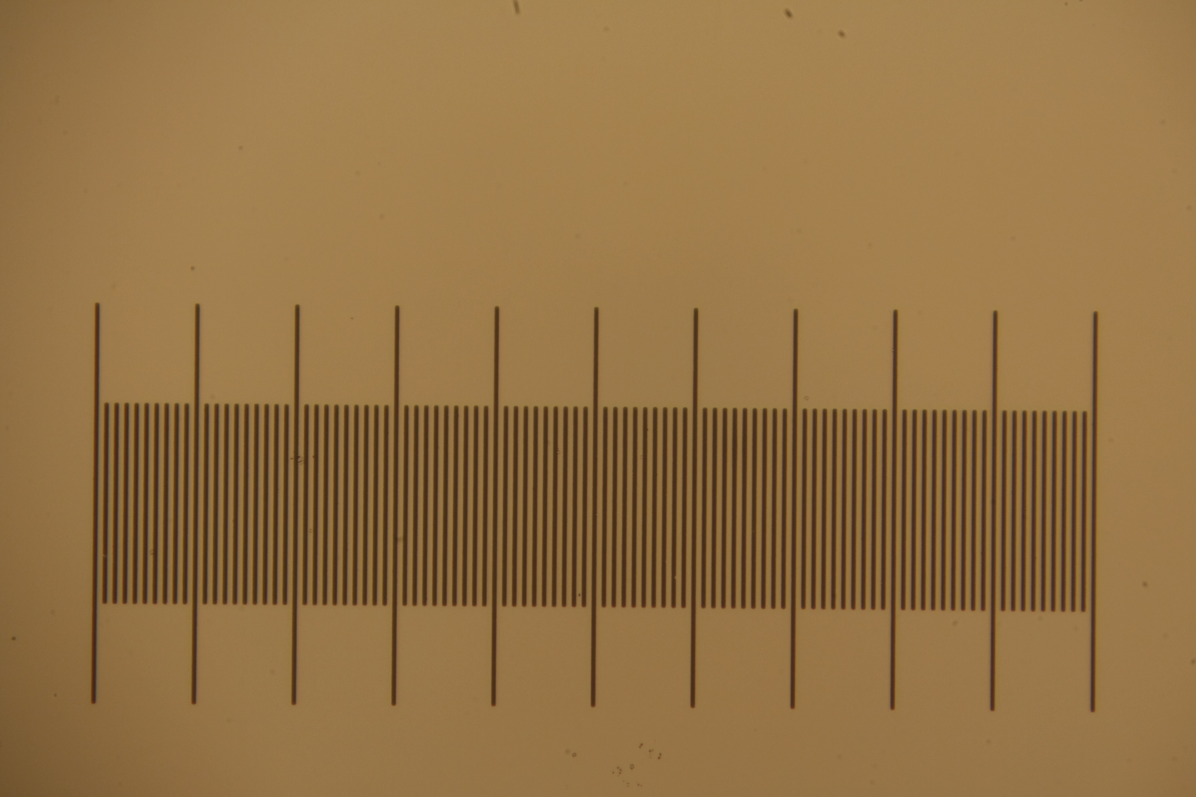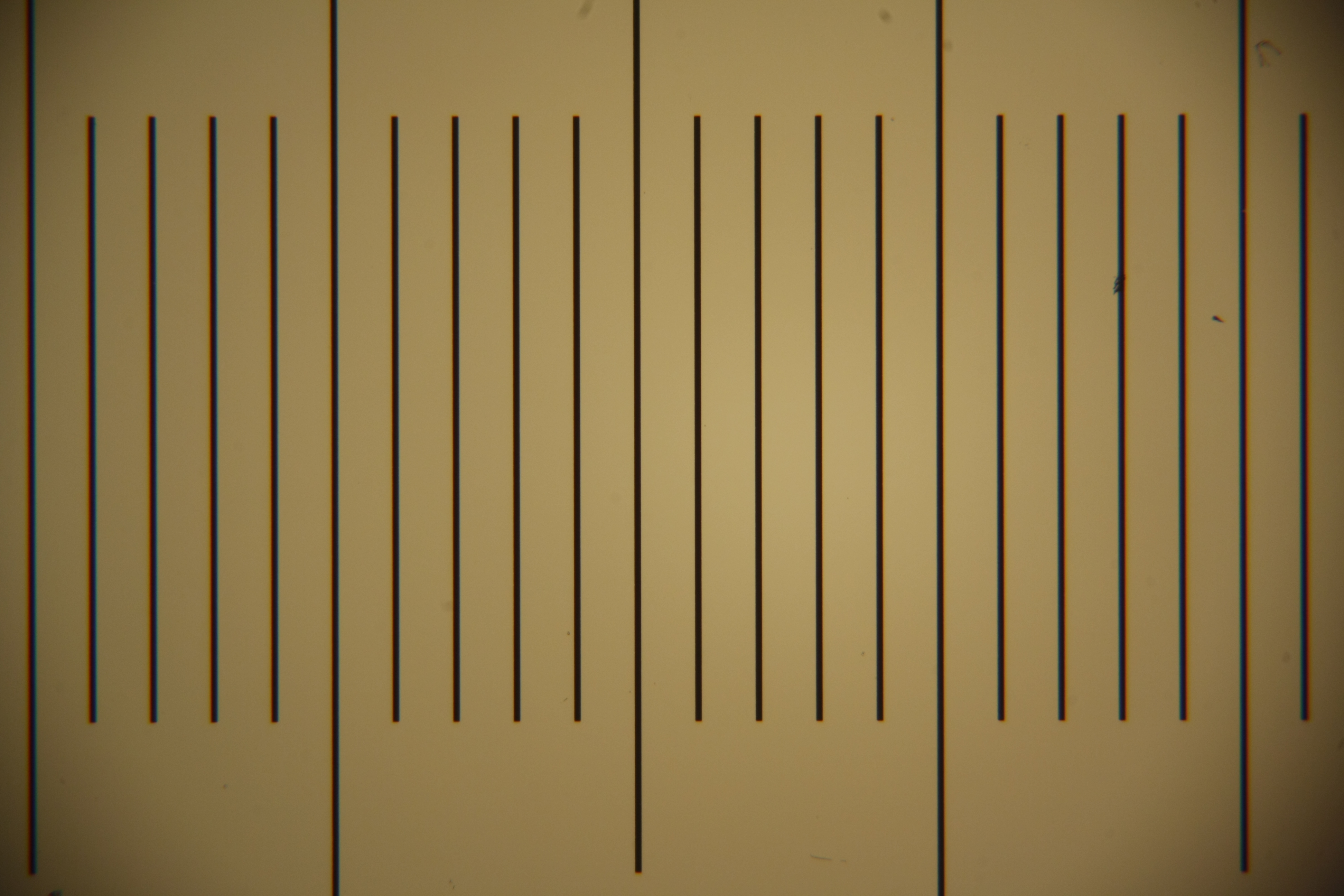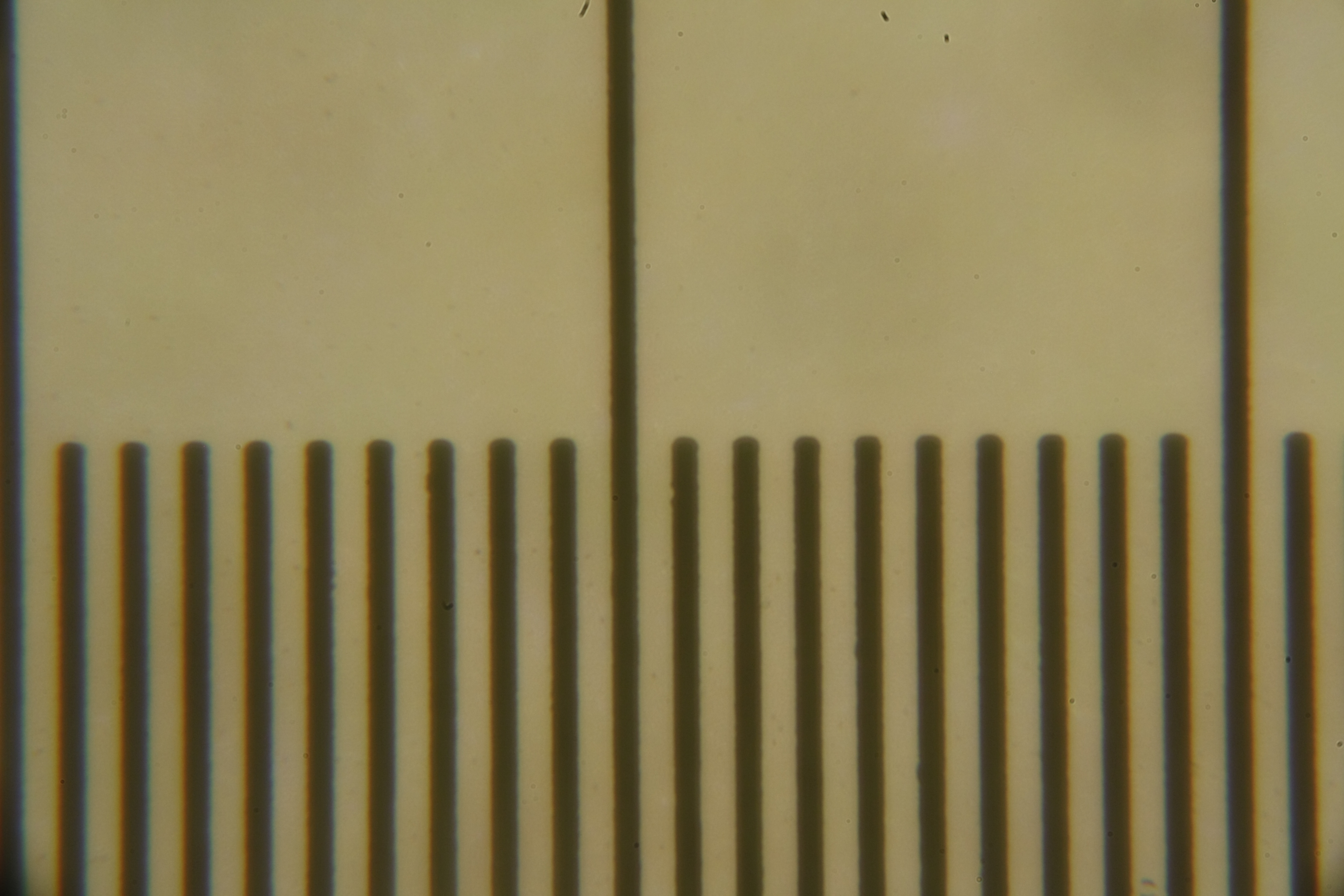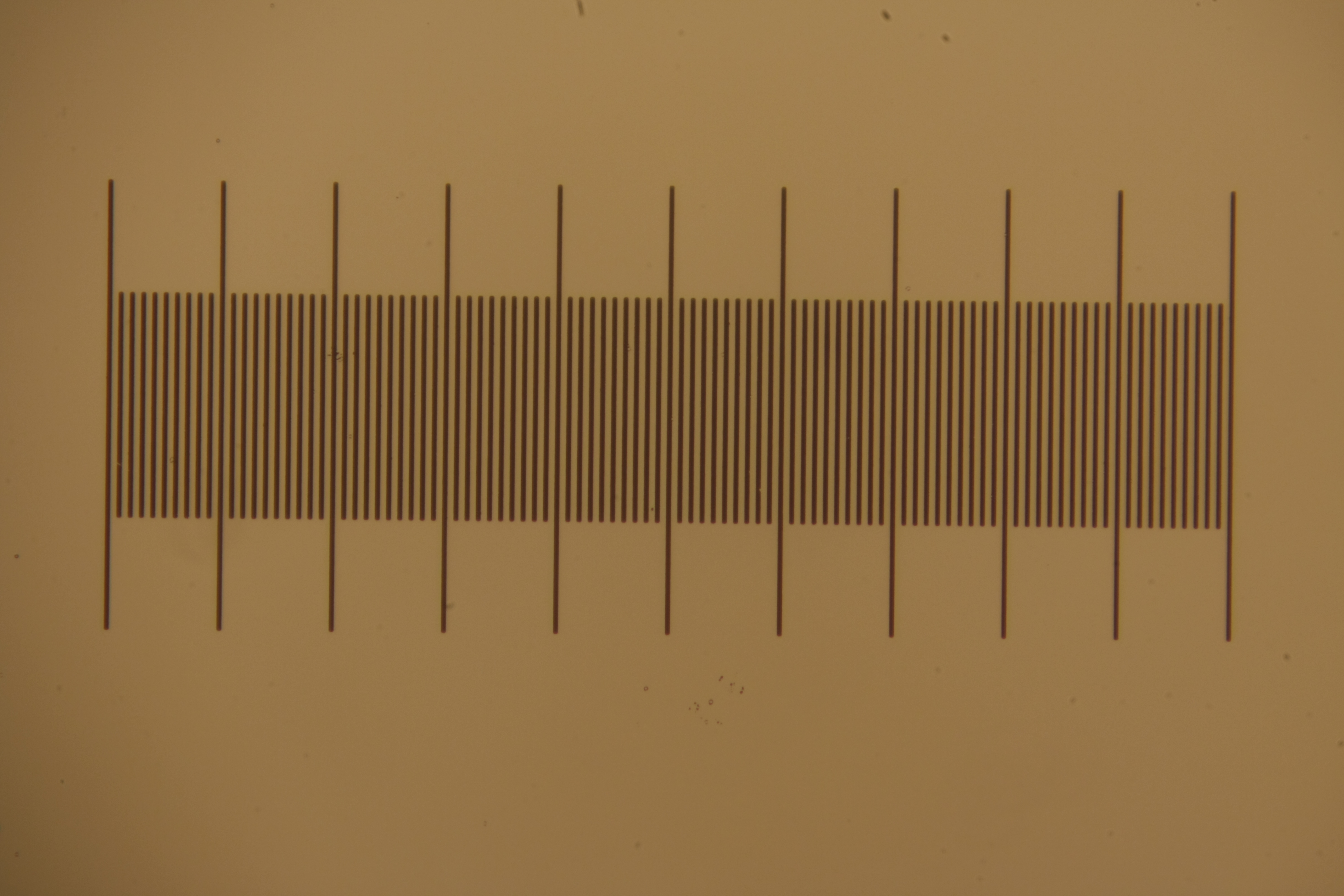 Mikroskoptest mit 0.1mm und 0.01mm Kalibrationsplatte